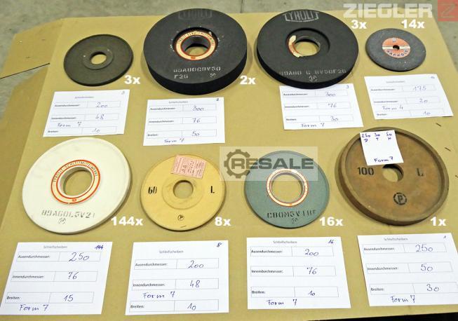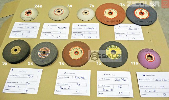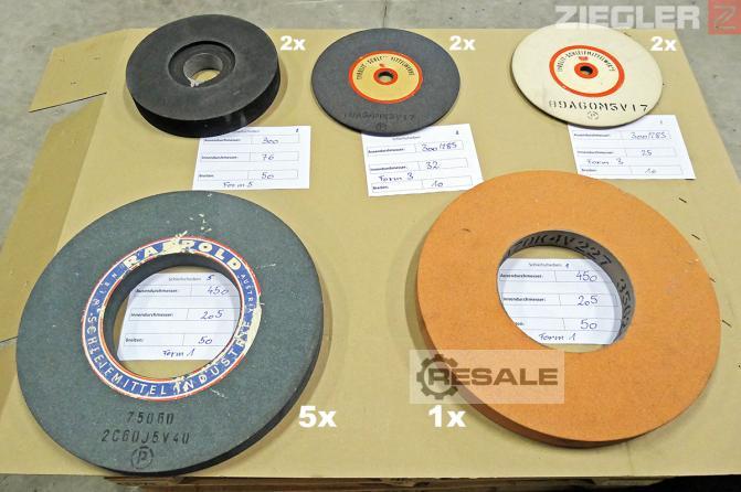 Varias muelas de alta calidad DM = 220 mm, ancho 30 + 40 mm, tamaño de grano de poro abierto 80 - 100- 120. Se puede utilizar para JUNG con diámetro dm 76.2mm, anillo intermedio hecho de aluminio dm 76.2 / 50.8mm disponible.