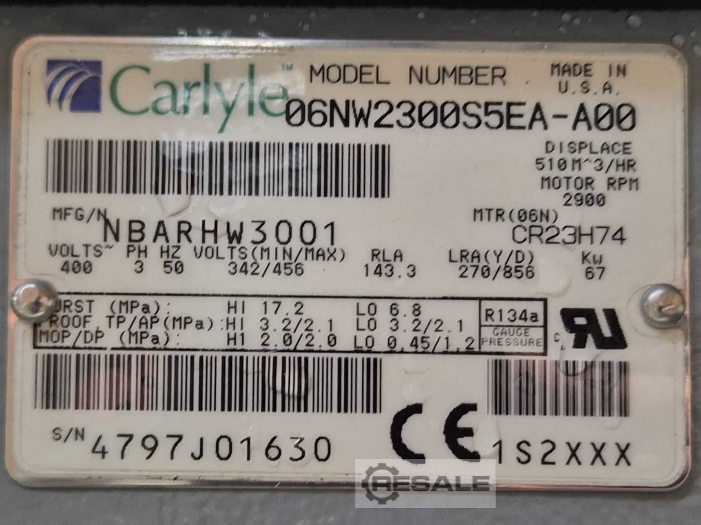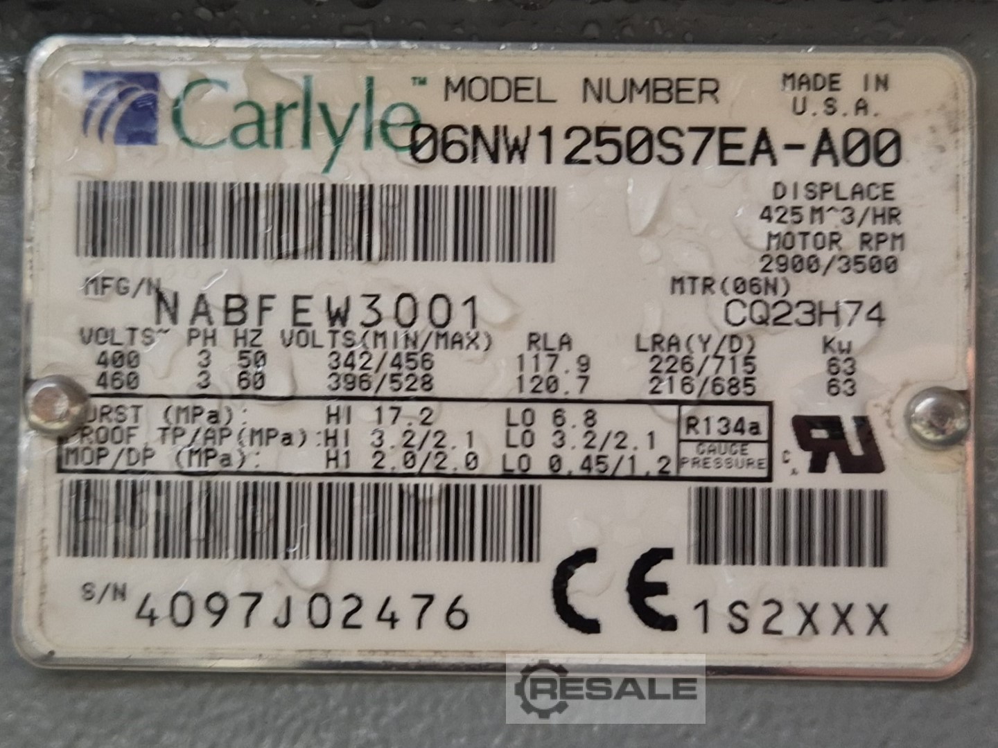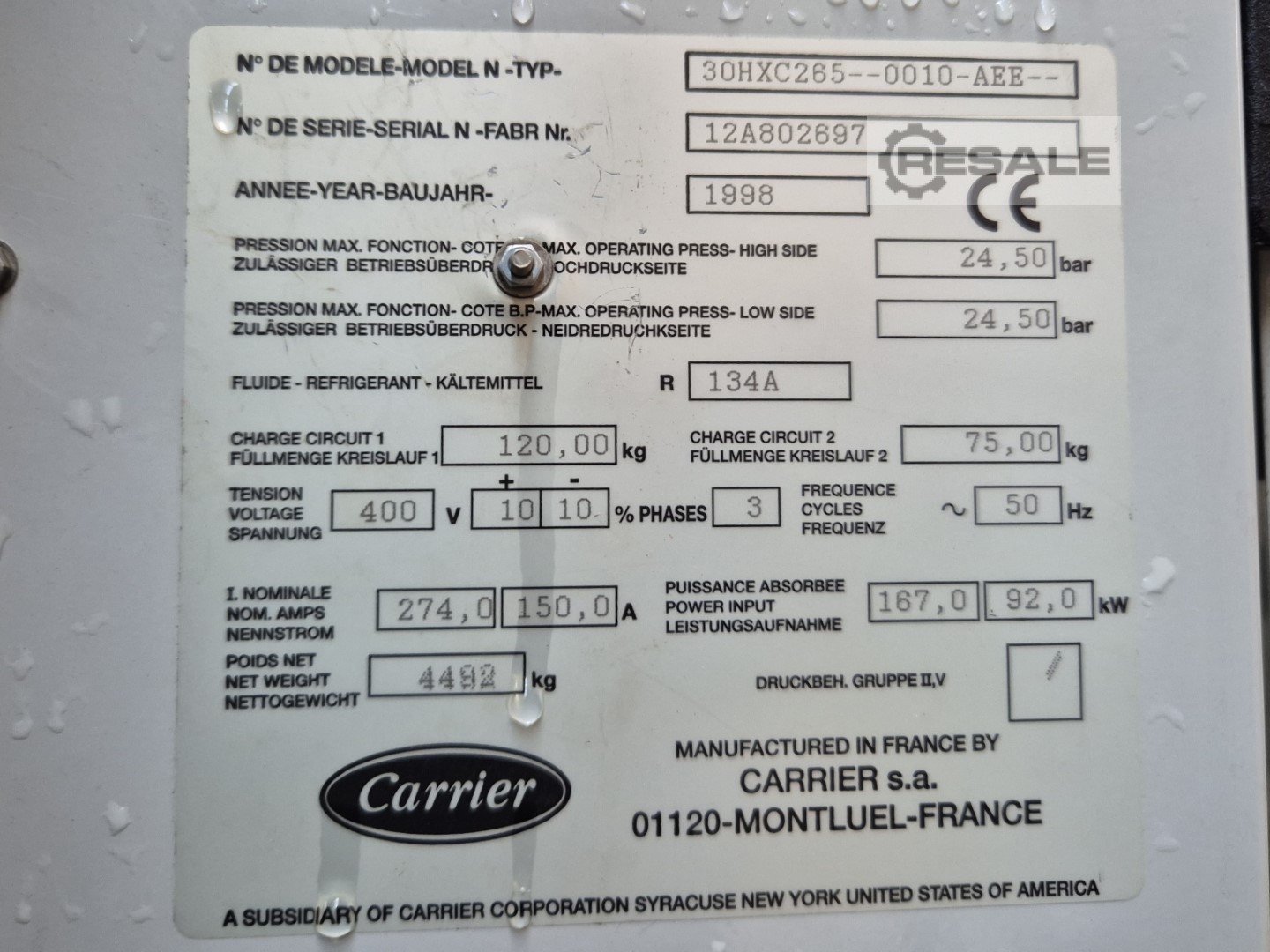 Usé un enfriador refrigerado por agua Carrier 30 HXC 265 en R134A. Incluye 2 compresores semiherméticos de tornillo Carrier 06NW2300S5EA-A00 y 1x Carrier 06NW1250S7EA-A00 semi-herméticos, condensador de carcasa y tubos, evaporador de carcasa y tubo, 2 bombas de aceite, armario de control con pantalla.