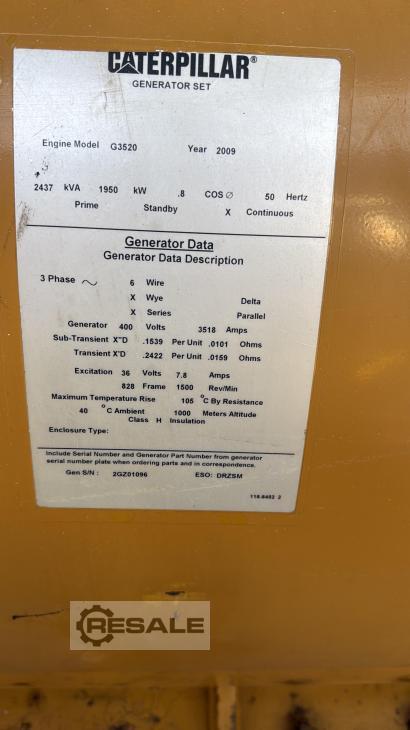 Rated capacity: 2000 KW Rated capacity in kVA: 2500 kVA Output voltage: 400 V Oruga de gas natural 3520-C