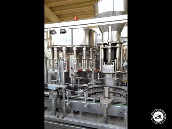 Usado para rellenar Tribloque GAI 12.1.16.1. Máquina de enjuague de 16 válvulas a 2500 bph con 12 pinzas, aplicando un solo tratamiento de aire soplado en la boca de la botella antes de enderezar. Los agarradores del carrusel varían manualmente en altura 1. Estación de 1 cabeza para vacío e inyección de gas antes de la máquina de llenado con altura variable 2. Máquina de llenar 16 grifos de vacío ligeros en la campana Campana de llenado variable manualmente en altura Botella mecánica de muelle que eleva pistones 1. tapador de 1 cabeza corcho recto, nivelador antes de cerrar con inyección de gas. En el tribloque usado hay un sistema de vacío antes de cerrar la botella