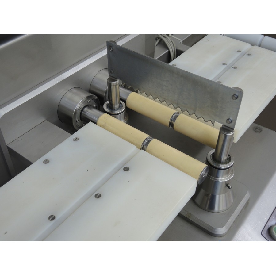 CORTADORA DE SALMÓN, MODELO DE ALIMENTO CP: CORTE DE SEDA TIPO DE CORTADORA: SC 180 Descripción técnica: Número de serie: :7527 Fuente de alimentación: 230/240 V, 1 Ph, 50/60 Hz, 7,5 A, 1,0 kW Entrada: Correa de alambre de plástico, ancho de la banda: (2x) 180 mm Salida: Correa de plástico, ancho de correa: (2x) 200 mm Rodillos de plástico, ancho de rodillo: (2x) 200 mm Dimensiones: 1800 x 1000 x 1550 mm La máquina está diseñada para cortar salmón ahumado, trucha y fletán de Groenlandia sin huesos ni piel, y con una temperatura de aproximadamente ?2 - +2? C. Es importante que el pez tenga la temperatura correcta.