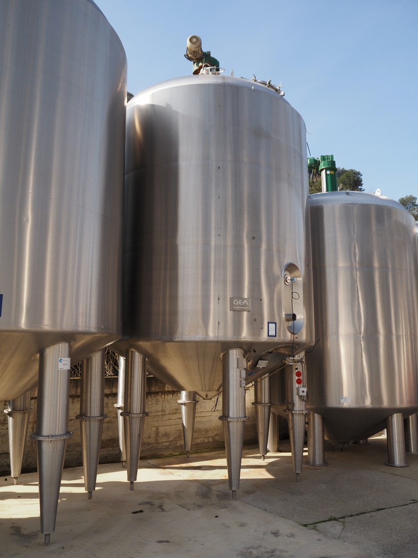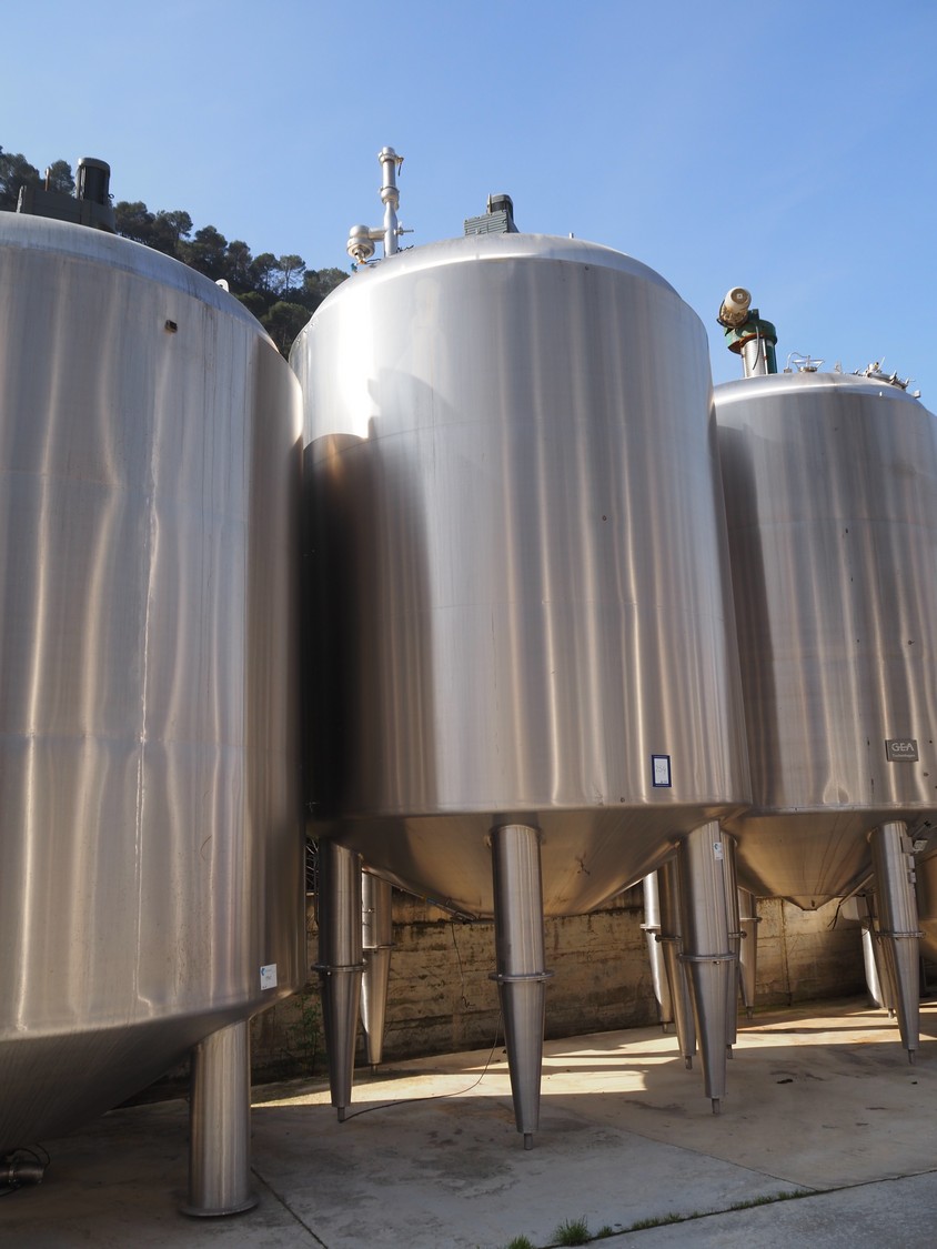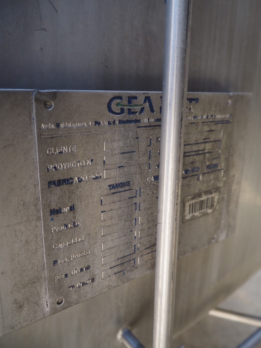 Tanque GEA s/s con doble camisa y agitador, año de construcción: 1998, capacidad: 30.000 litros, dimensiones interiores: 3200 mm x 3400 mm, dimensiones totales: 3400 mm x 6500 mm.
