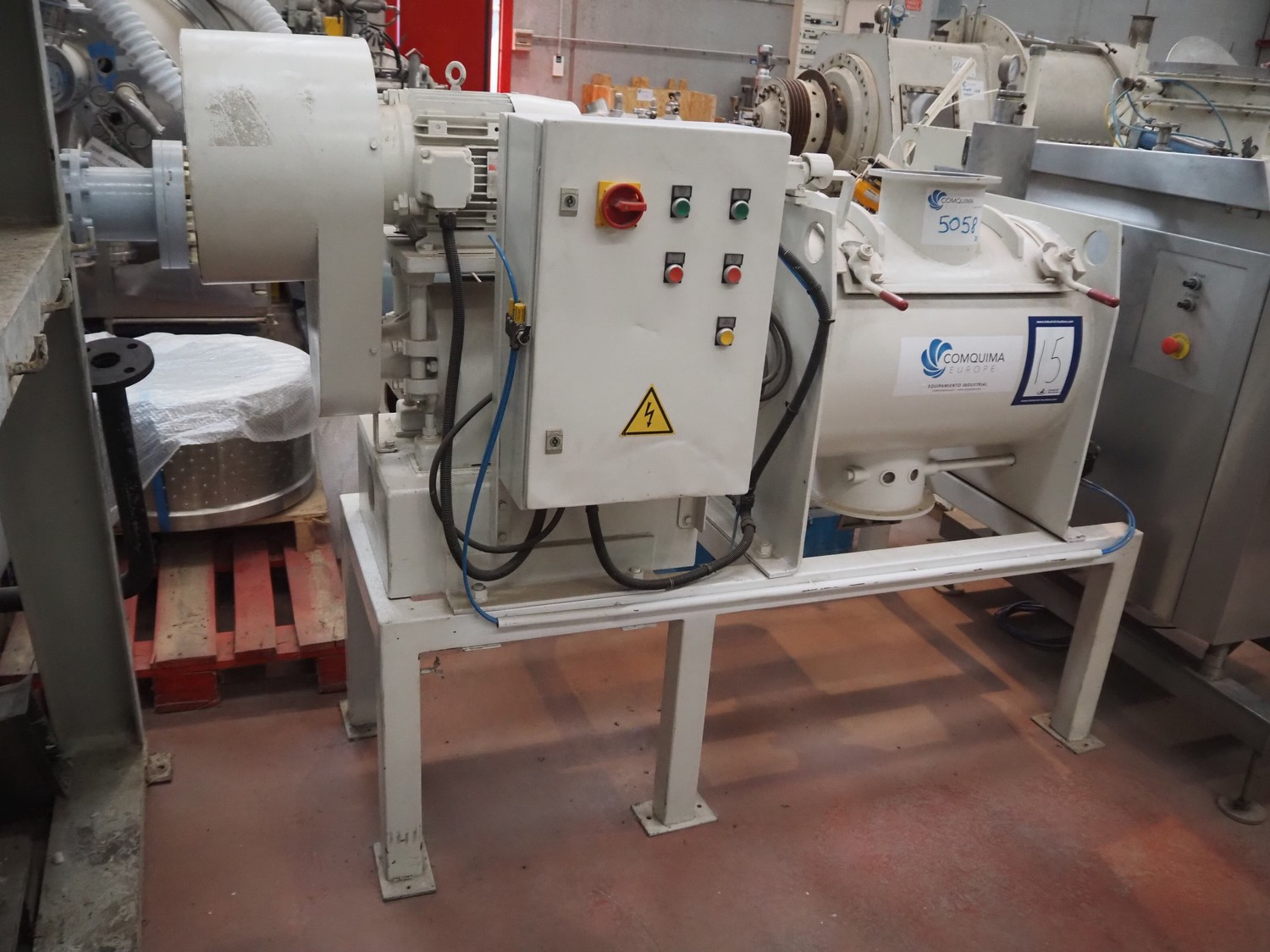 Mezclador Lödige con doble camisa, modelo: FKM2000D, número: 1226, año de construcción: 1973, volumen: 2000 litros, volumen de la camisa: 135 litros, dimensiones mezclador: 2850 mm x 1250 mm x 1800 mm, motor Schorsch, 55 kW, dimensiones: 1800 mm x 950 mm x 1200 mm.