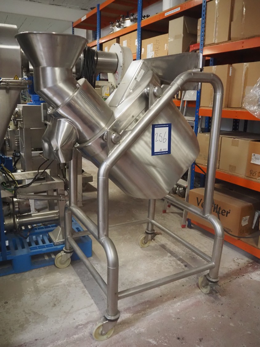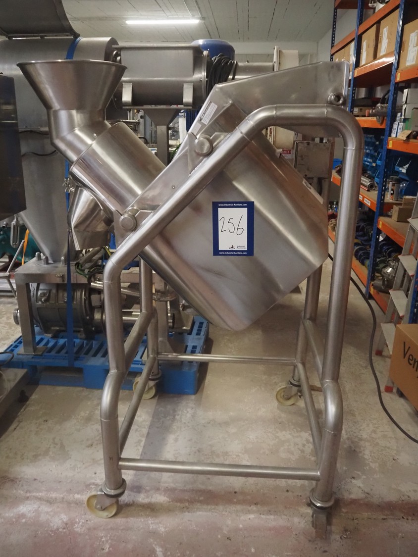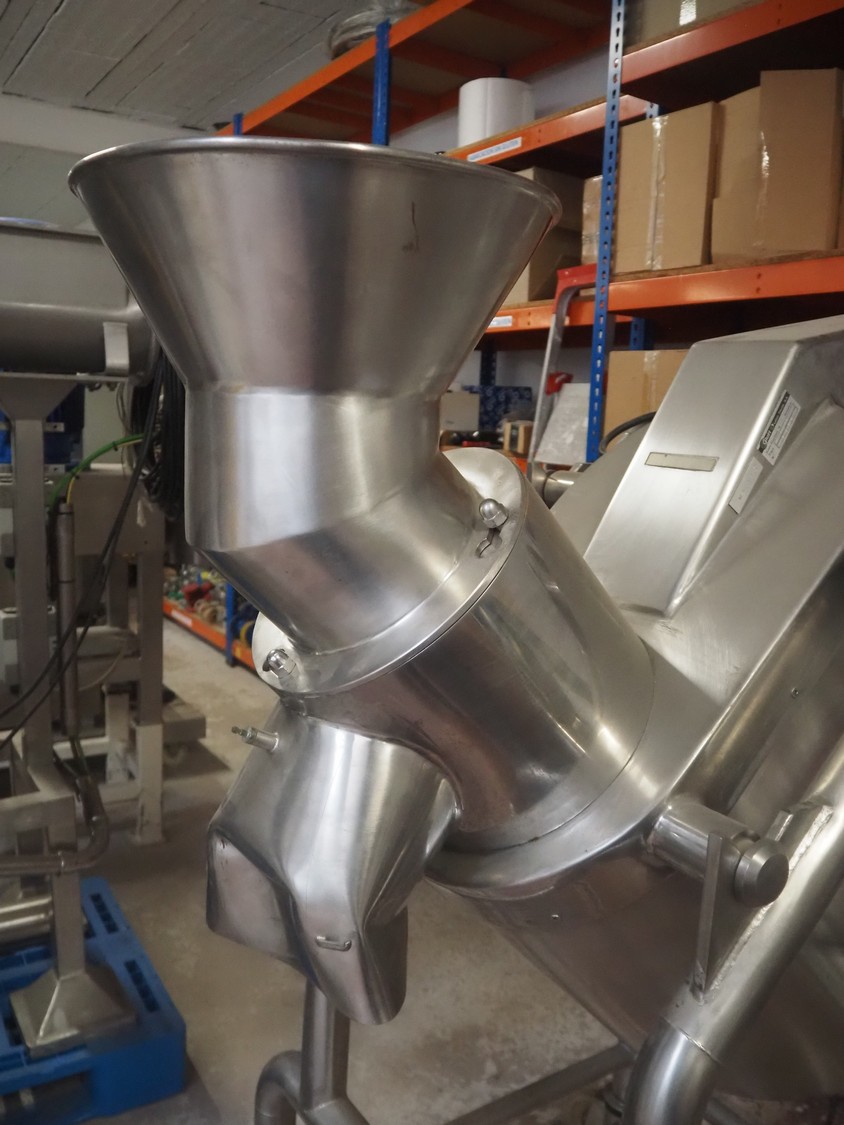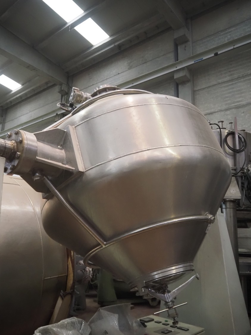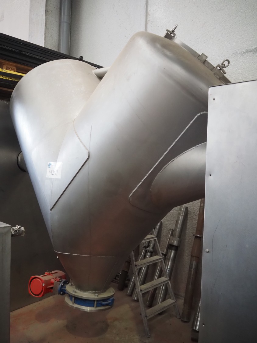 Mezclador en V Iprocomsa, modelo: B-1000, año de construcción: 1998, 5,5 kW, volumen: diámetro de entrada: (2x) 580 mm, diámetro de salida: 250 mm, dimensiones totales: 4010 mm x 1300 mm x 2510 mm.