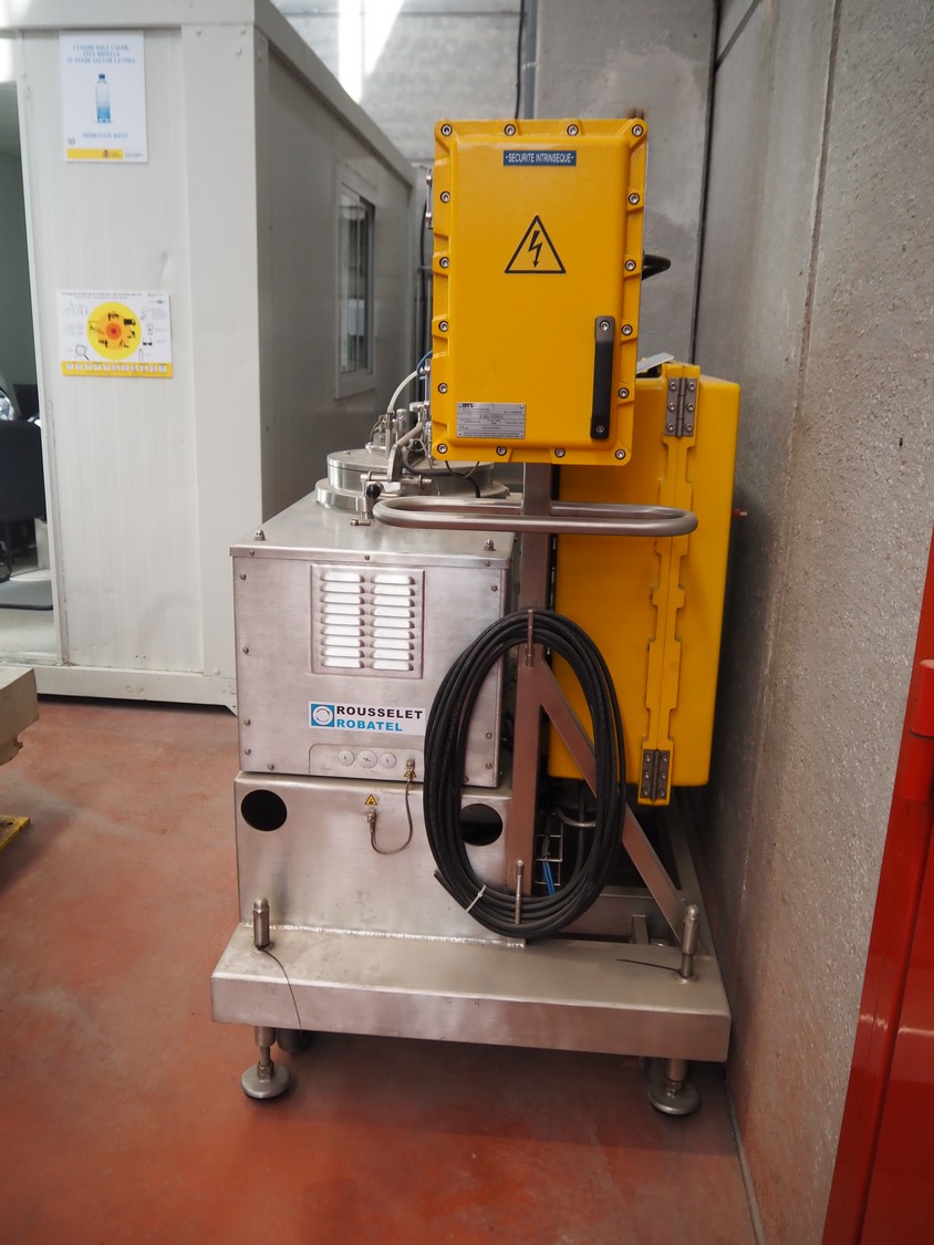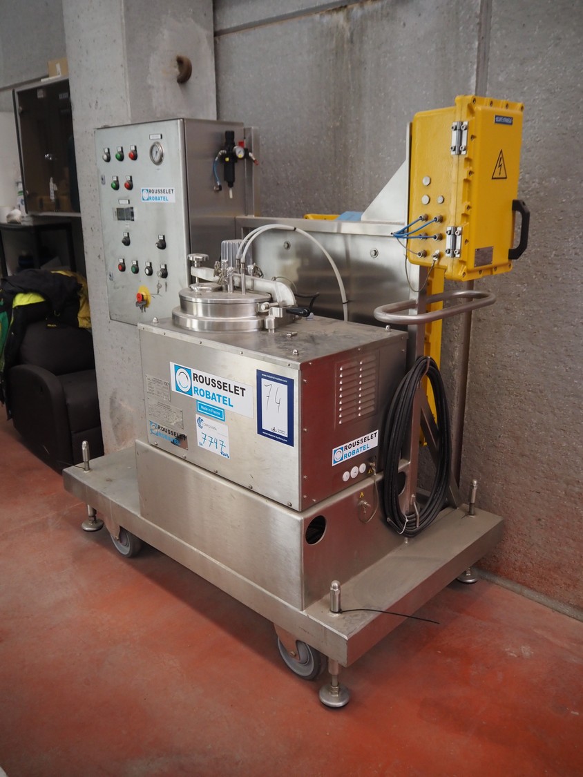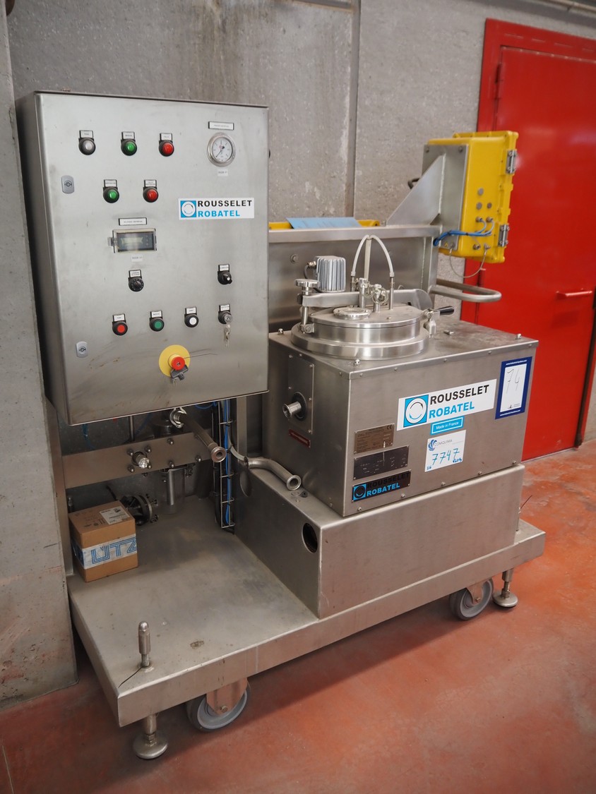 Centrífuga móvil Rousselet Robotel, tipo: RC20VX R, número: 35328, año de construcción: 2017, 400 V, 3 Ph, 50 Hz, diámetro de la cesta: 200 mm, dimensiones totales: 2100 mm x 1200 mm x 2000 mm.