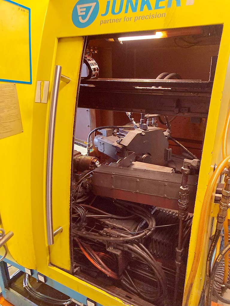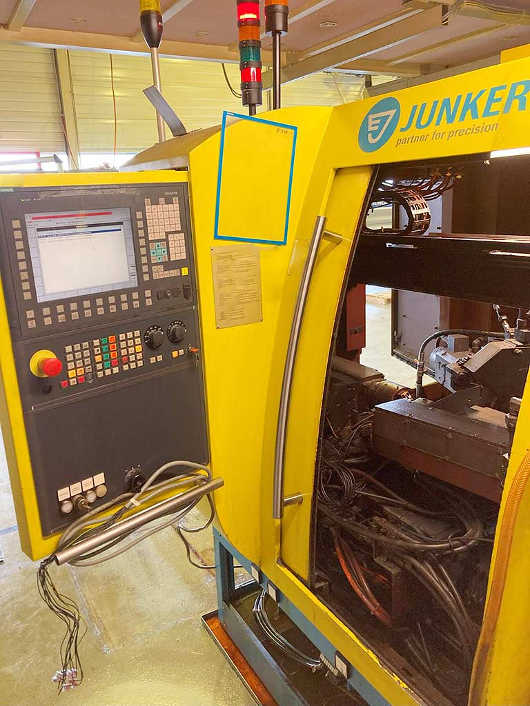 Está disponible una rectificadora cilíndrica CNC Junker revisada en 2019. Longitud de esmerilado: 150 mm, altura central: 100 mm, peso máximo de la pieza de trabajo: 5 kg, diámetro máximo de rectificado: 500 mm, diámetro orbital: 80 mm, diámetro de la muela: 400 mm. Dimensiones de la máquina X/Y/Z: aprox. 2850 mm/1450 mm/2000 mm, peso: aprox. 2000 kg, control: Siemens Sinumerik. Incluye enfriador BKW, sistema de lubricante refrigerante Knoll VL 1000/4000 con contenedor de 6500l y reenfriador industrial Hyfra. Documentación disponible. Es posible la inspección in situ.