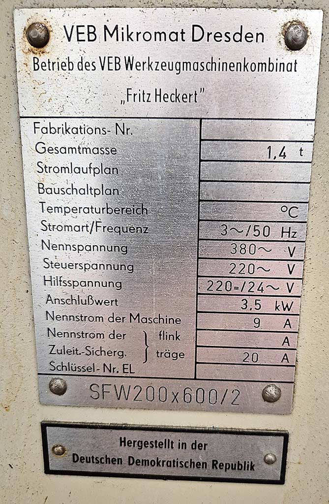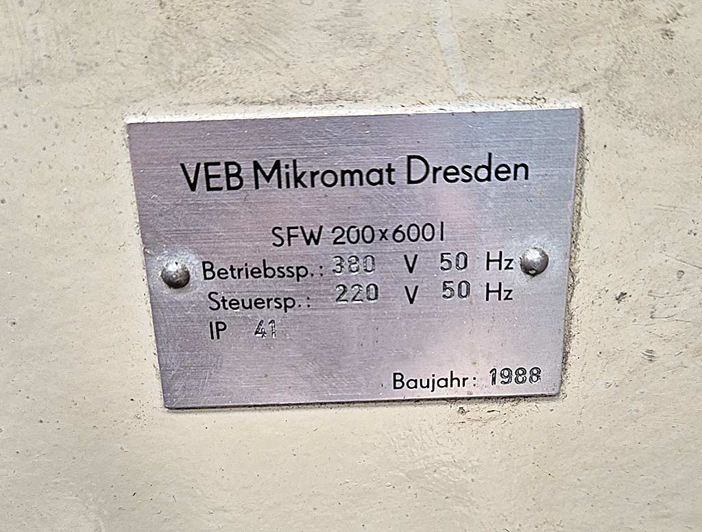Ancho de lijado: 200 mm, longitud de lijado: 600 mm, trayectoria de ajuste X/Y: 690 mm/230 mm, distancia entre ejes del husillo de la mesa de sujeción: 500 mm, diámetro de la rueda de lijado: 200 mm, ancho de la rueda de lijado: 20 mm, diámetro: 51 mm, dimensiones de la mesa X/Y: 200 mm/600 mm, carga máxima de la mesa: 110 kp, dimensiones de la máquina X/Y/Z: aprox. 3000 mm/1600 mm/2100 mm, peso: aprox. 1300 kg. Documentación disponible. Es posible la inspección in situ.