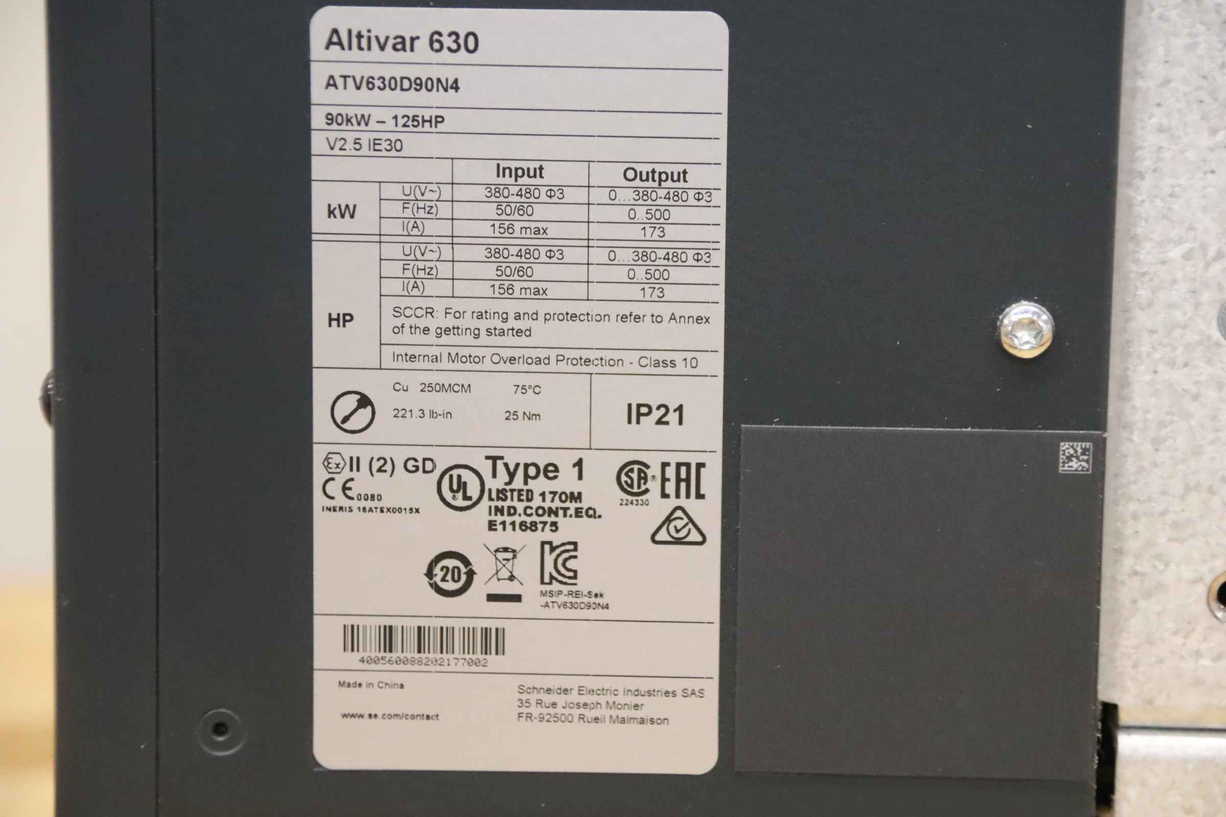 Frequency converter, frequency inverter, drive converter, controller, variable speed drive, converter, inverter -Manufacturer: Schneider Electric, frequency converter Altivar 630 -Type: ATV630D90N4 -Power: 90 kW -Input: 380-480V / 50/60Hz / 156 A -Output: 380-480V / 0-500 Hz / 173 A -Number: 2 frequency converters available -Price: per piece -Dimensions: 800/290/325 mm -Weight: 55 kg/piece