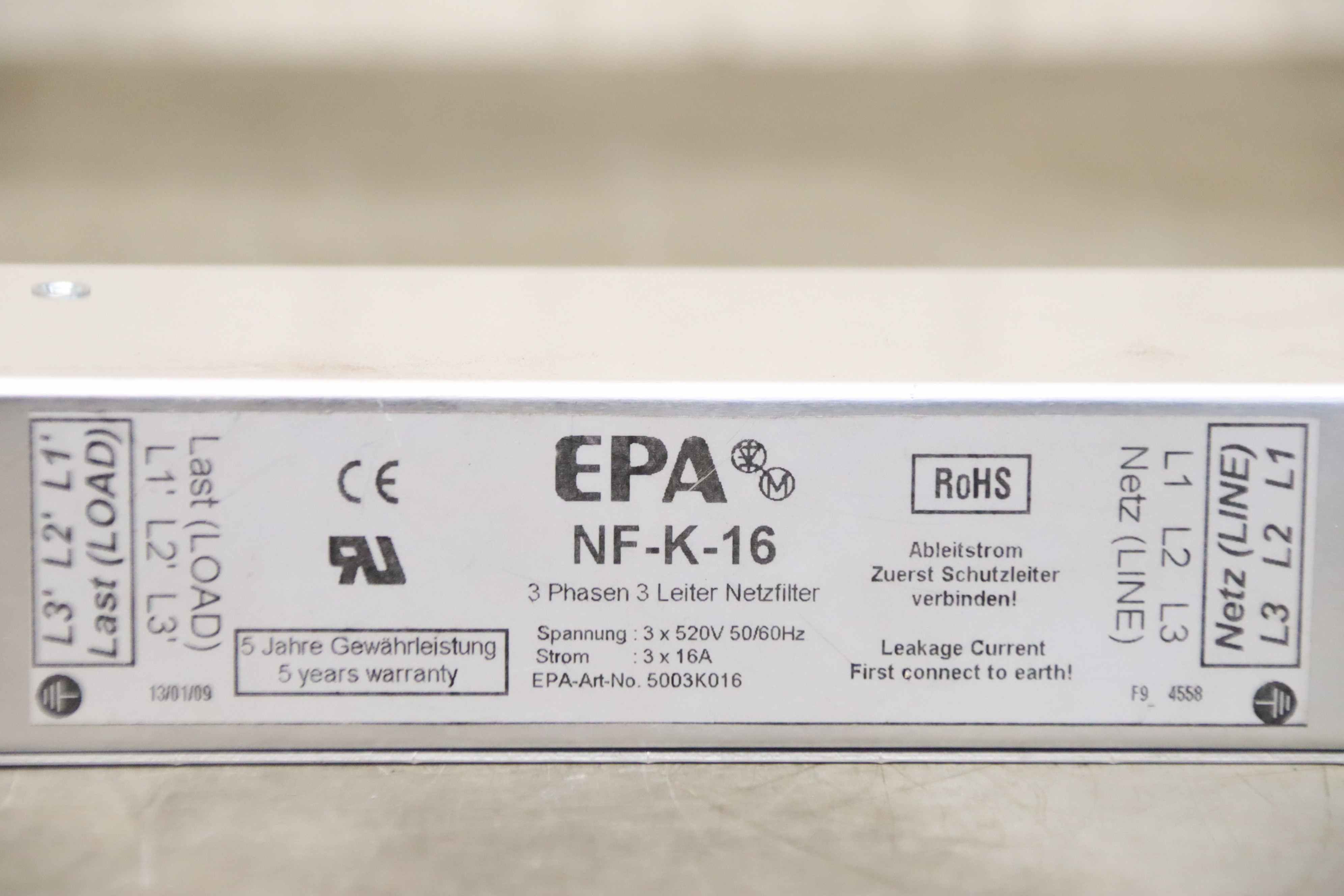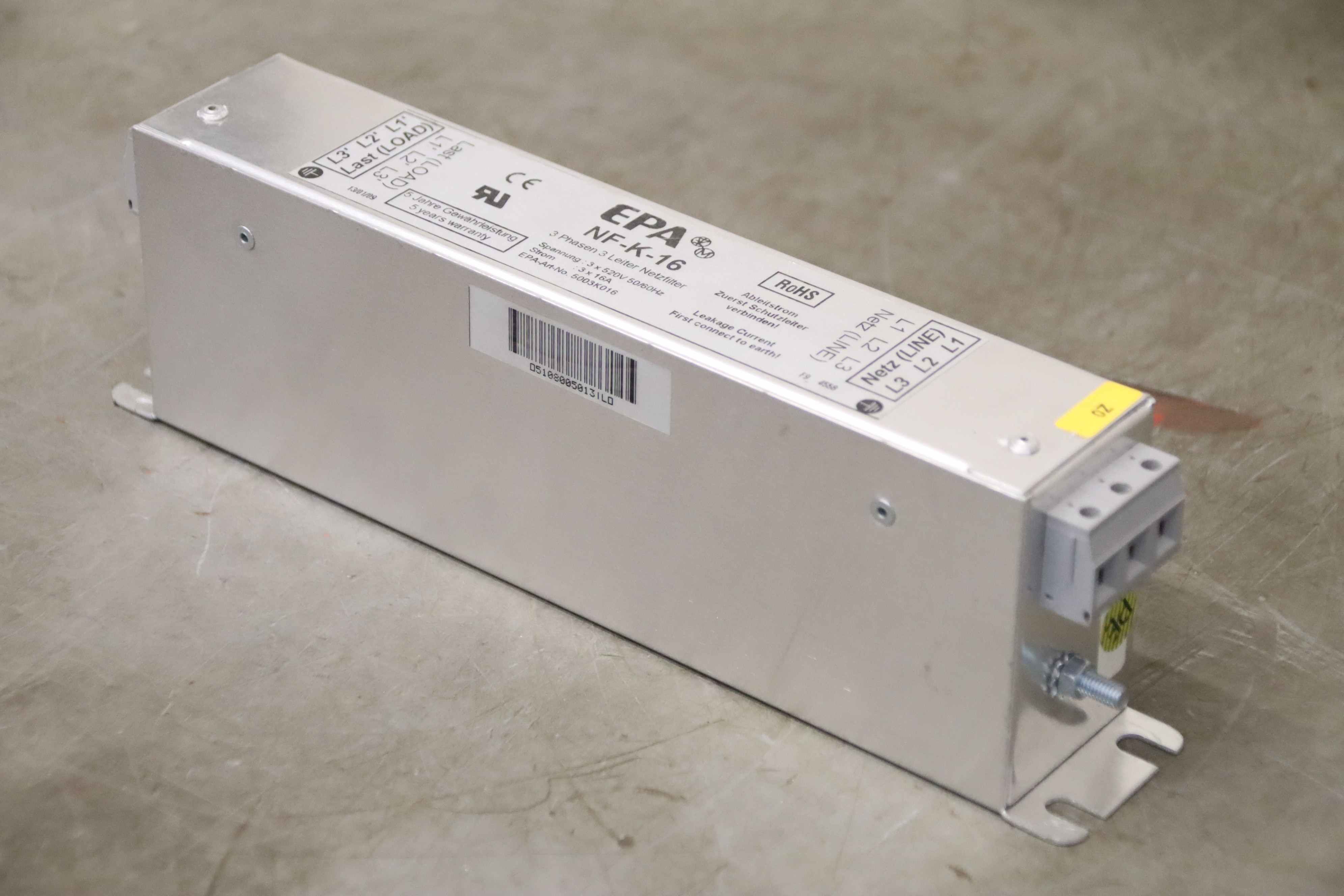 Mains filter, power line filter, three-phase filter, three-phase mains filter, filter module-Manufacturer: EPA, line filter three-phase-Type: NF-K-16-Number: 3x filters available-Price per piece-Dimensions: 250/45/H70 mm-Weight: 0.8 kg/pc.