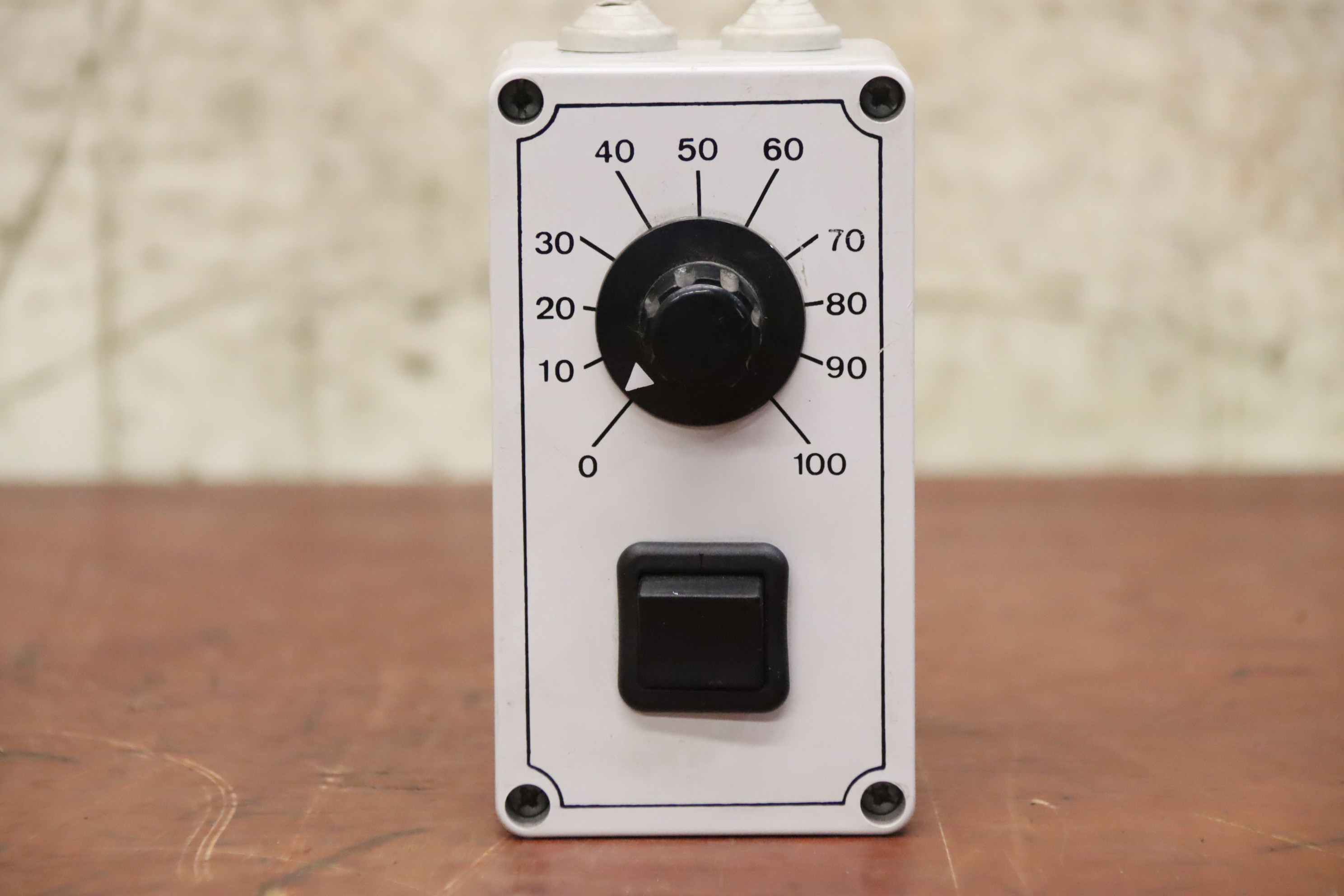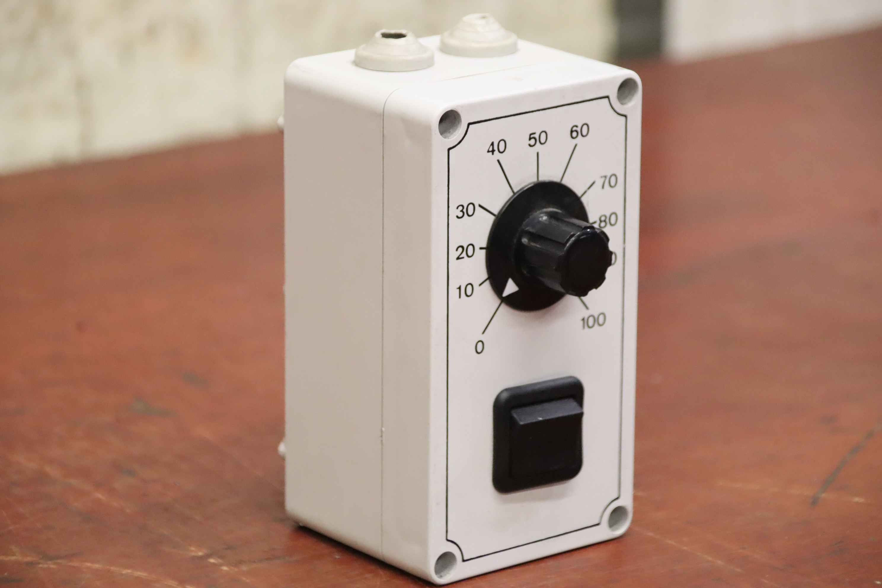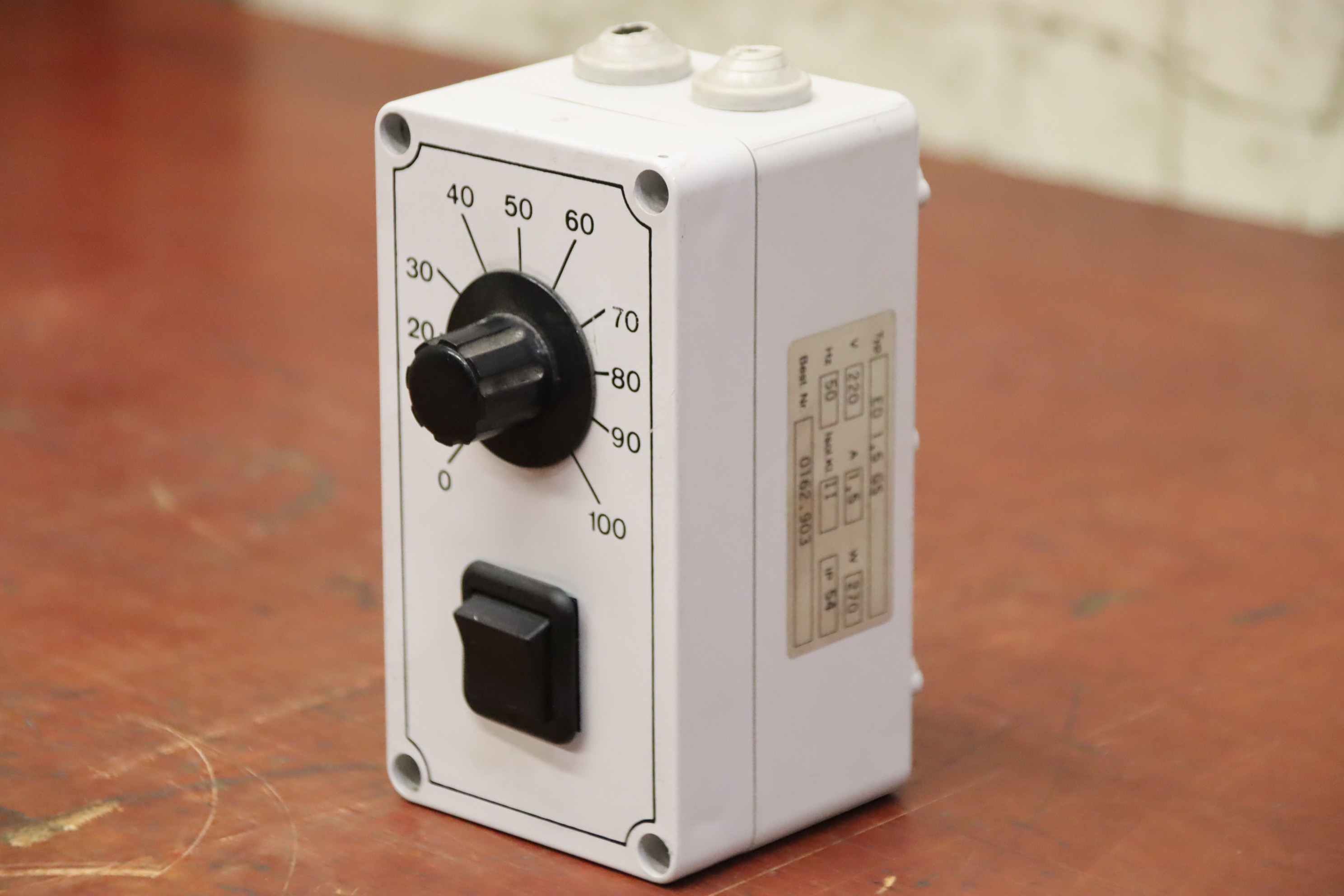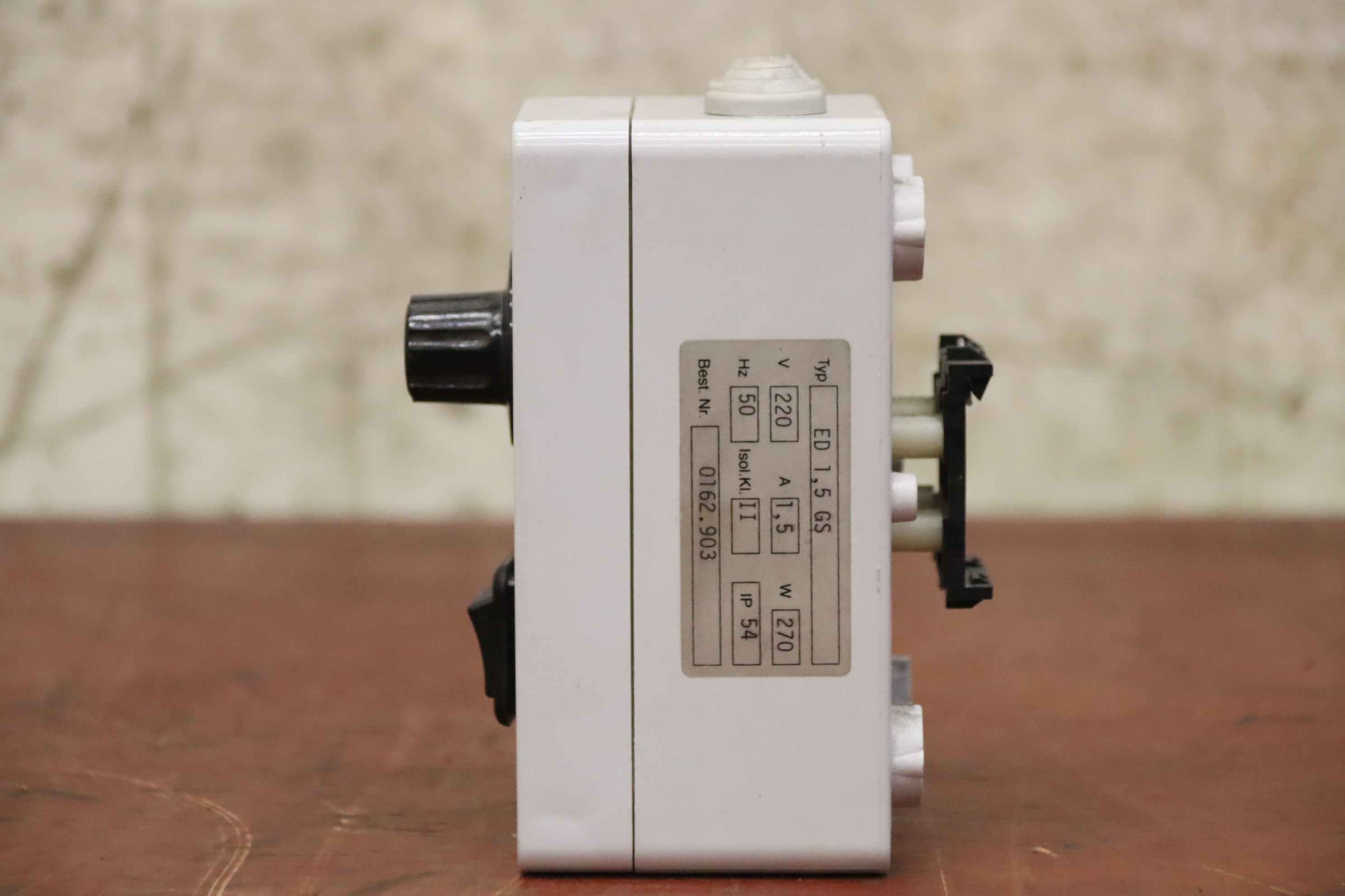 Power resistor, wire potentiometer, resistor, potentiometer, double potentiometer, regulator-Manufacturer: Elvo, potentiometer controller with on/off switch-Type: ED 1.5 GS-Voltage 220 V 1.5 A 270 W-Dimensions: 105/75/H135mm-Weight: 0.3 kg