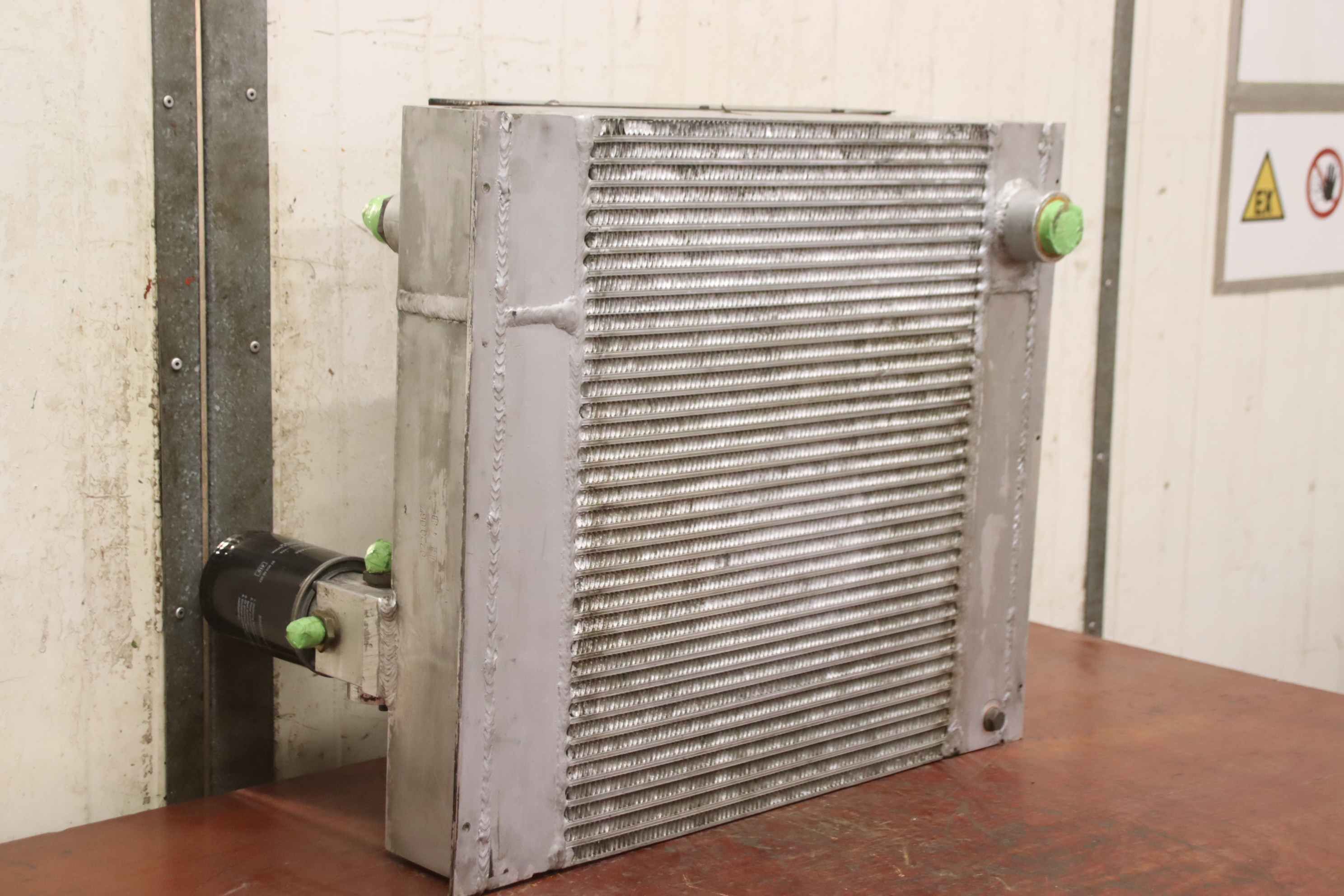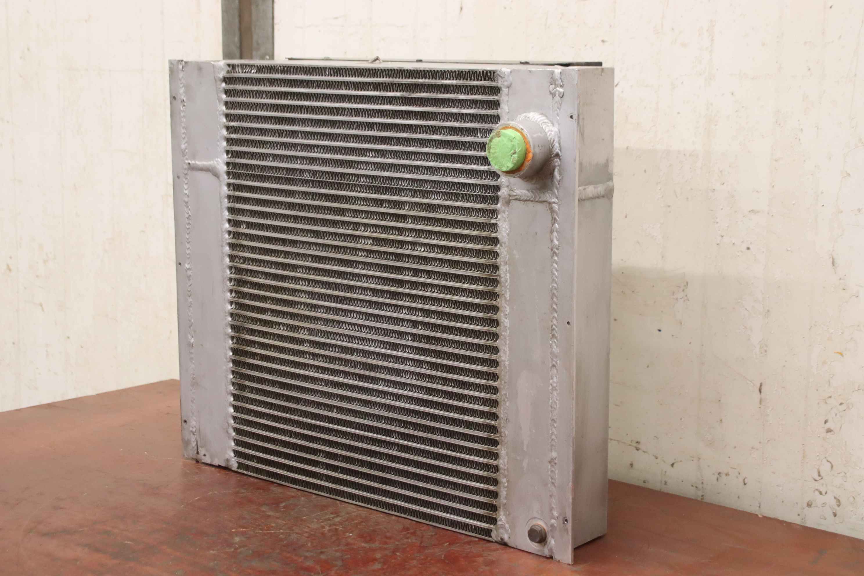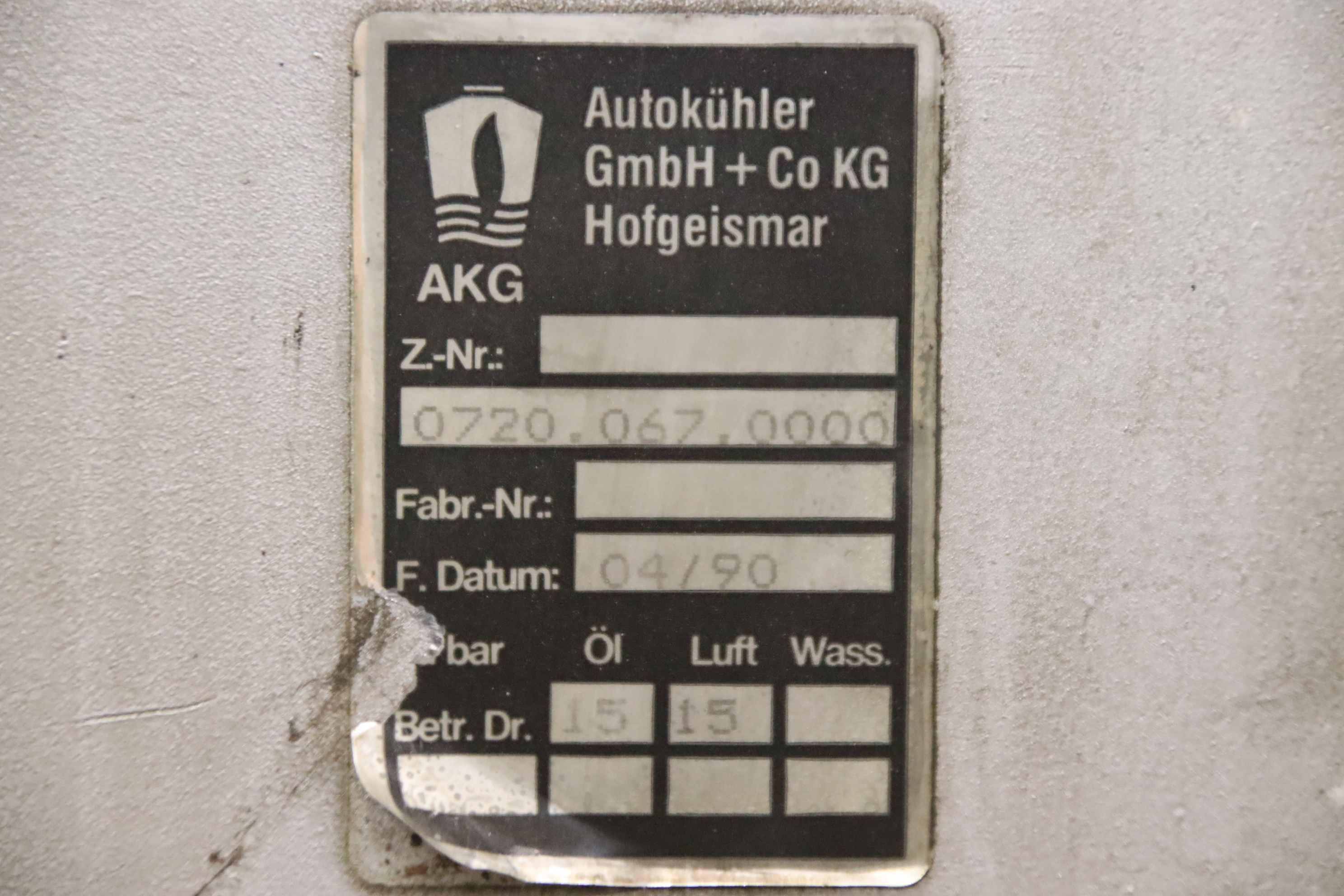 standard cooler, car cooler, oil cooler, heat exchanger -Manufacturer: AKG, light metal oil/air cooler from screw compressor Boge VLED 30R-11A -Type: 0720.067.000 -Pressure: max. 15 bar -Dimensions: 650/360/H550 mm -Weight: 40 kg