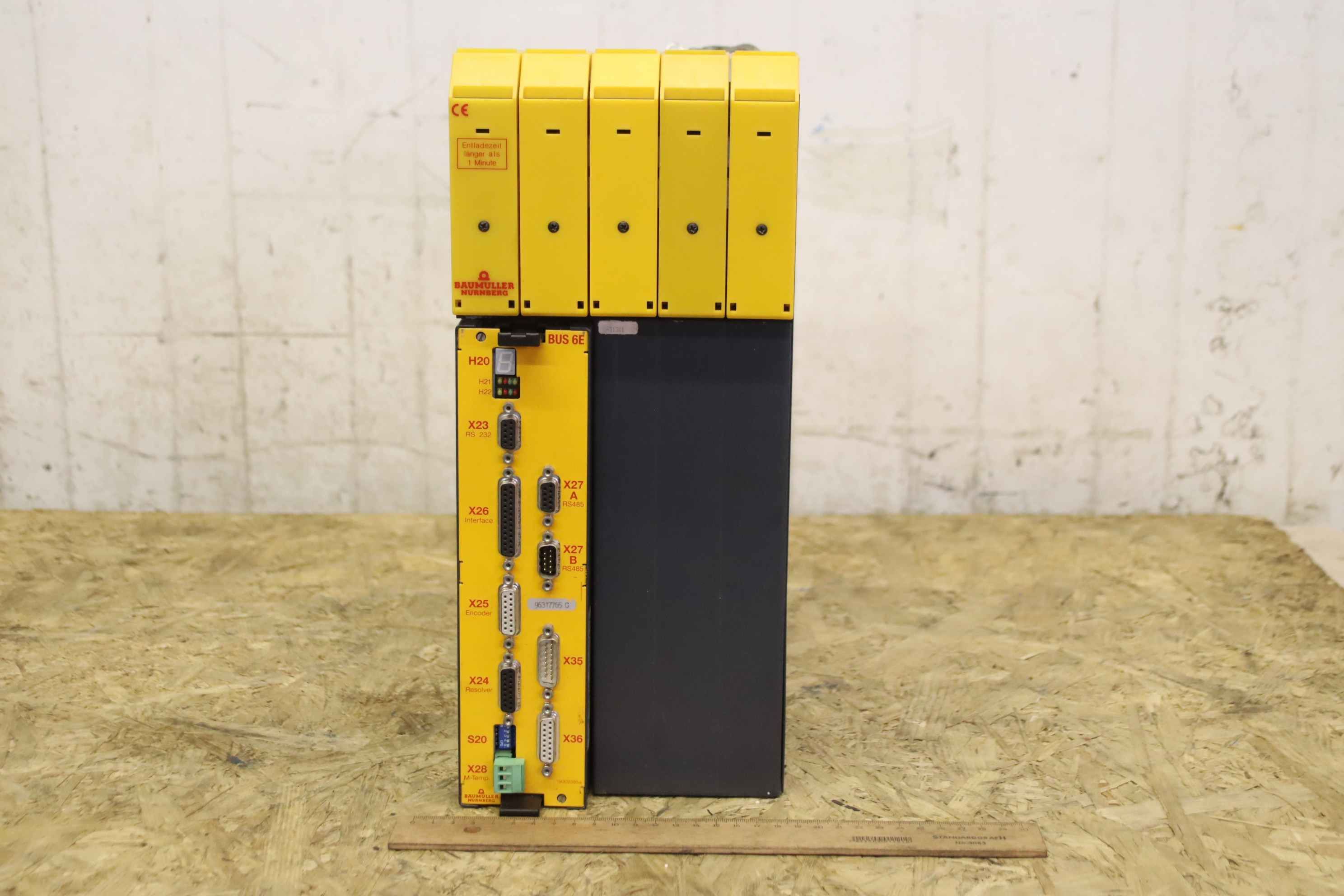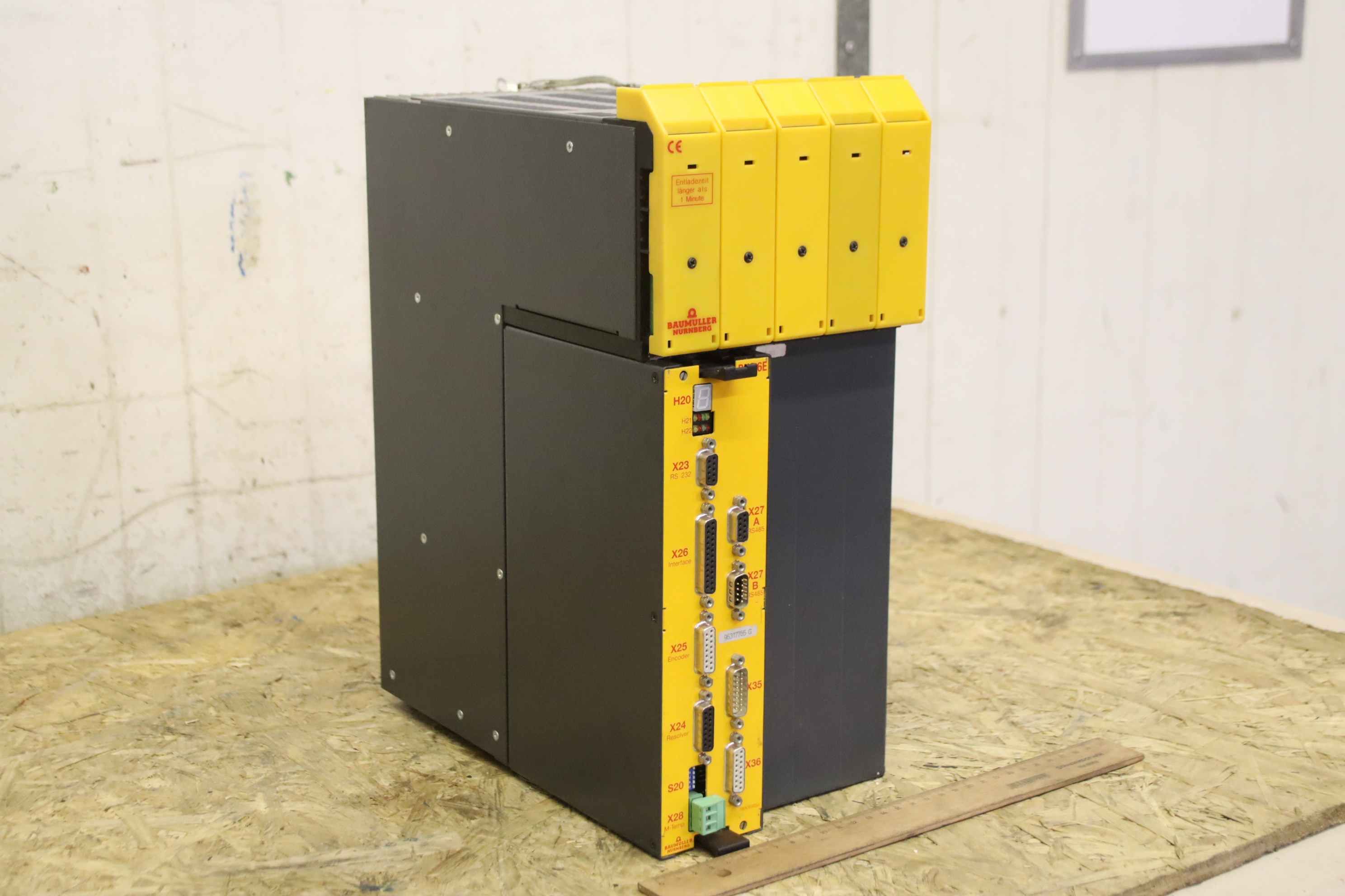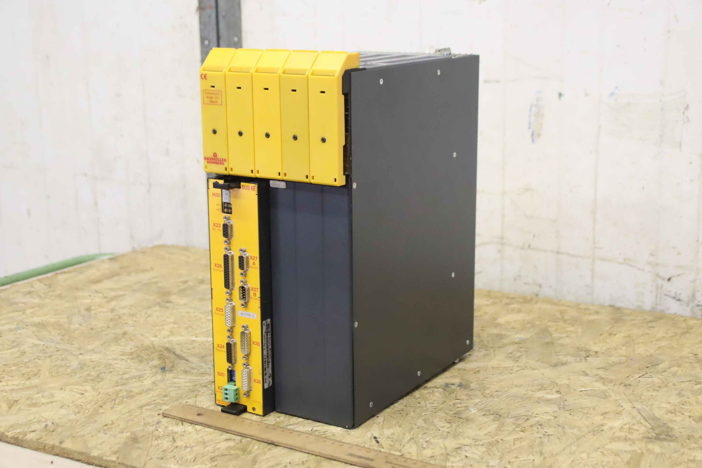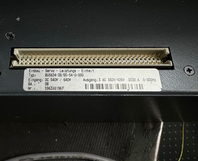 Basic - feed-in unit, feed-in module, converter, frequency converter, frequency converter, drive converter, controller, variable speed drive -Manufacturer: Baumüller, servo power unit BUS624-38/55-54-0-000 -Built-in control device: Controller BUS 6E -Type: BUS6-E-SM-0012-A011-0000 -Number: 3x devices available -Price: per piece -Dimensions: 300/165/H380 mm -Weight: 11.9 kg/piece