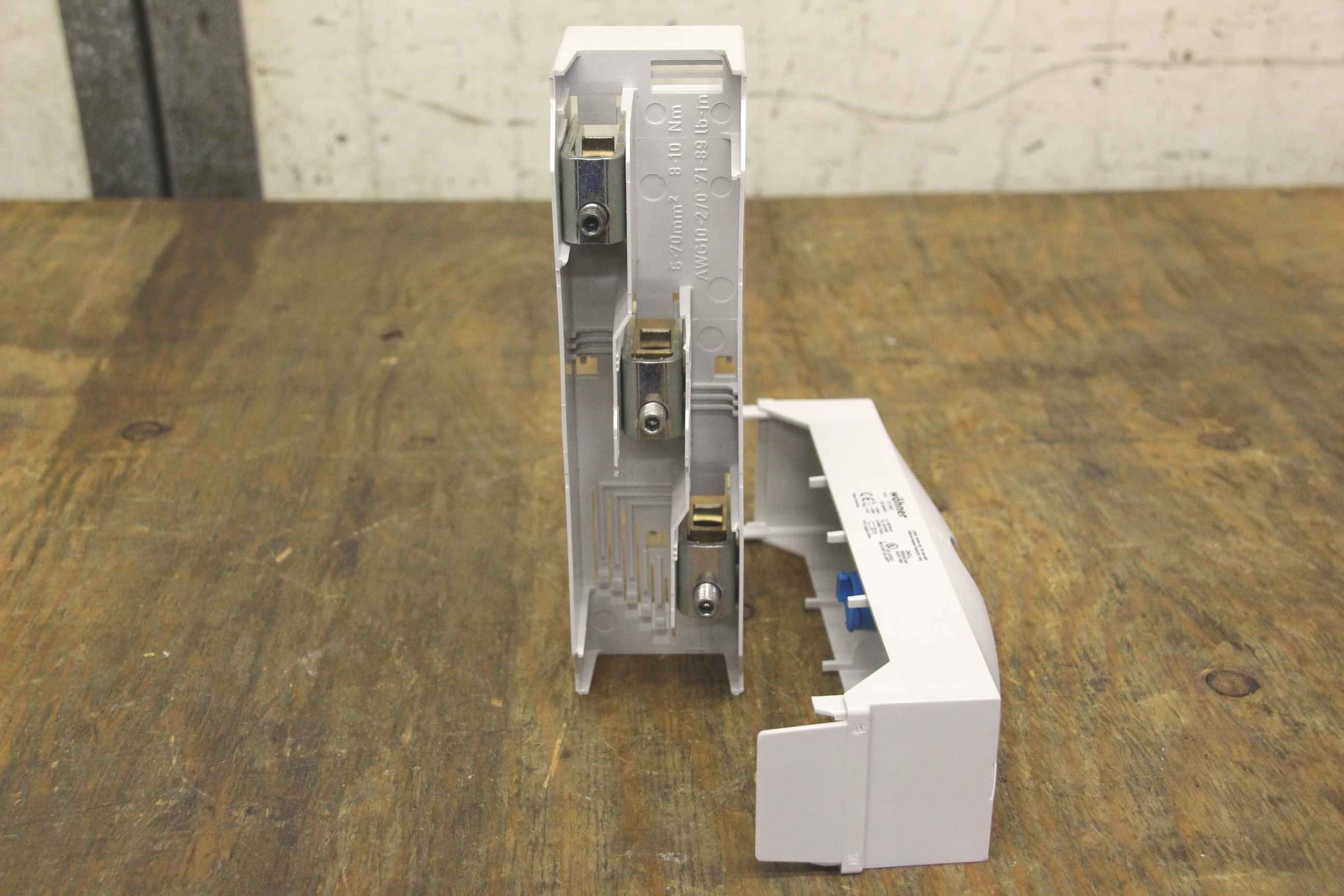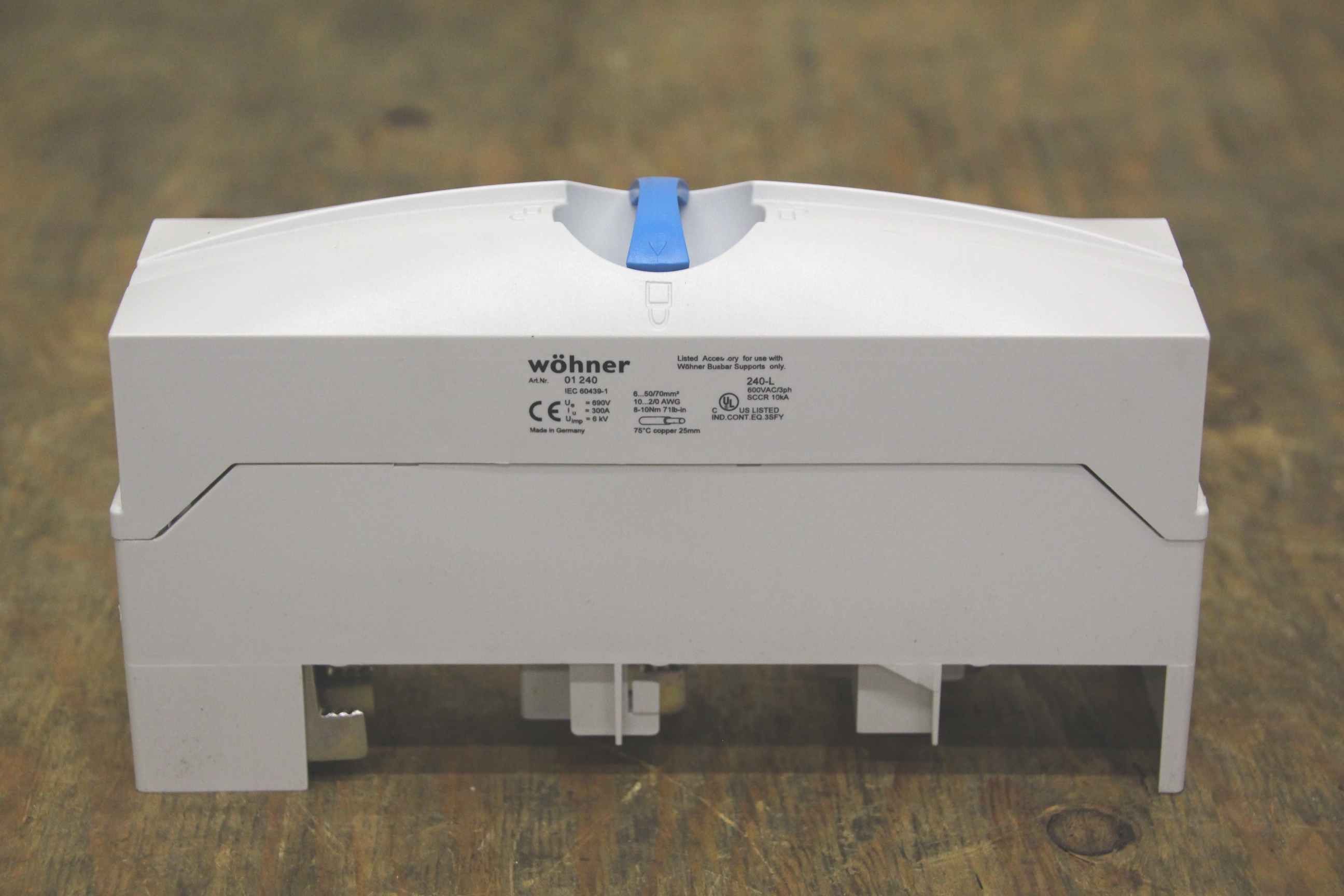 Control cabinet and distributor construction, busbars, busbar supports, busbar adapters, terminal plates-Wöhner item no.: 01 240-Number: 9 pieces available-Price: per piece-Dimensions: 200/55/H110 mm-Weight: 0.4 kg/piece