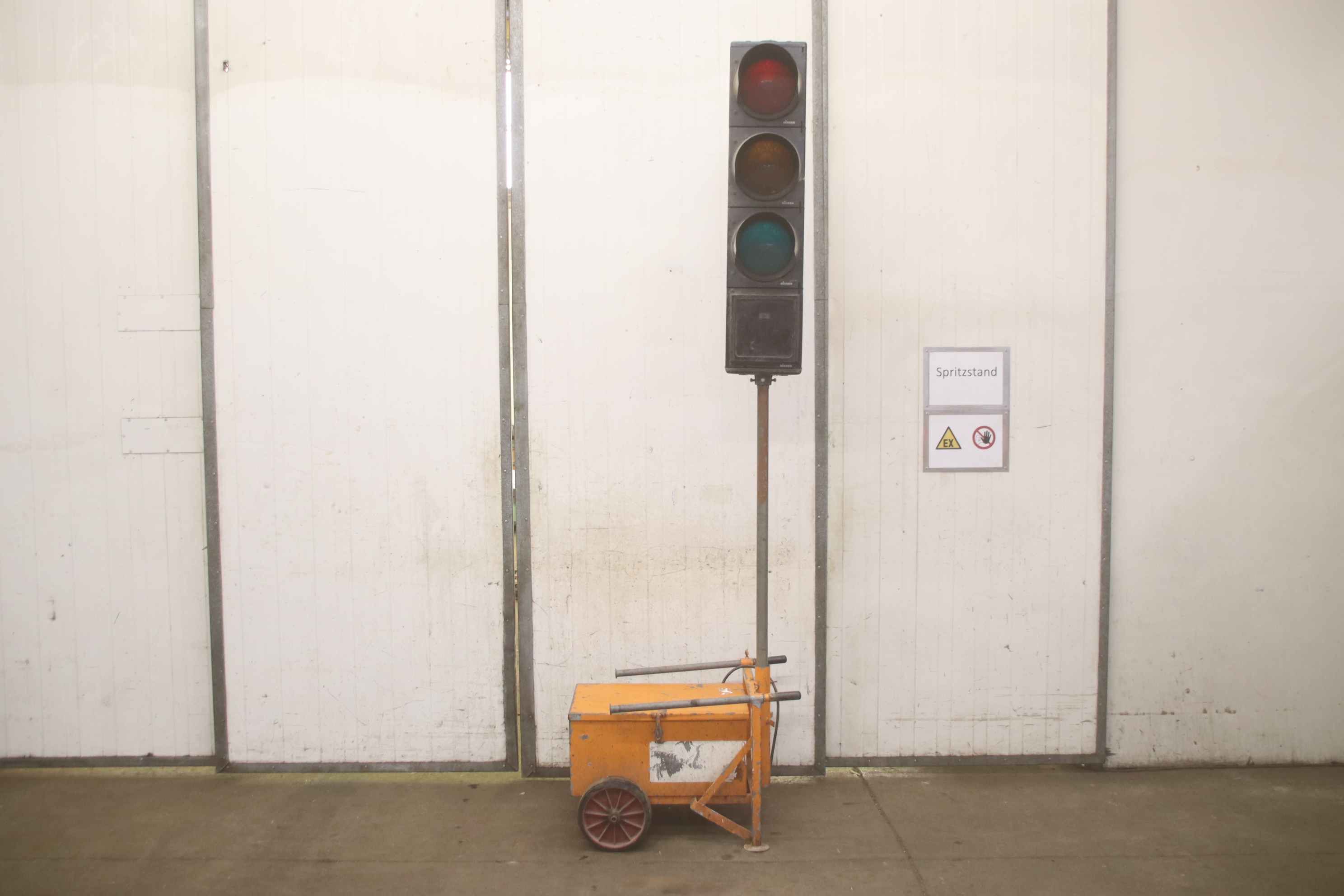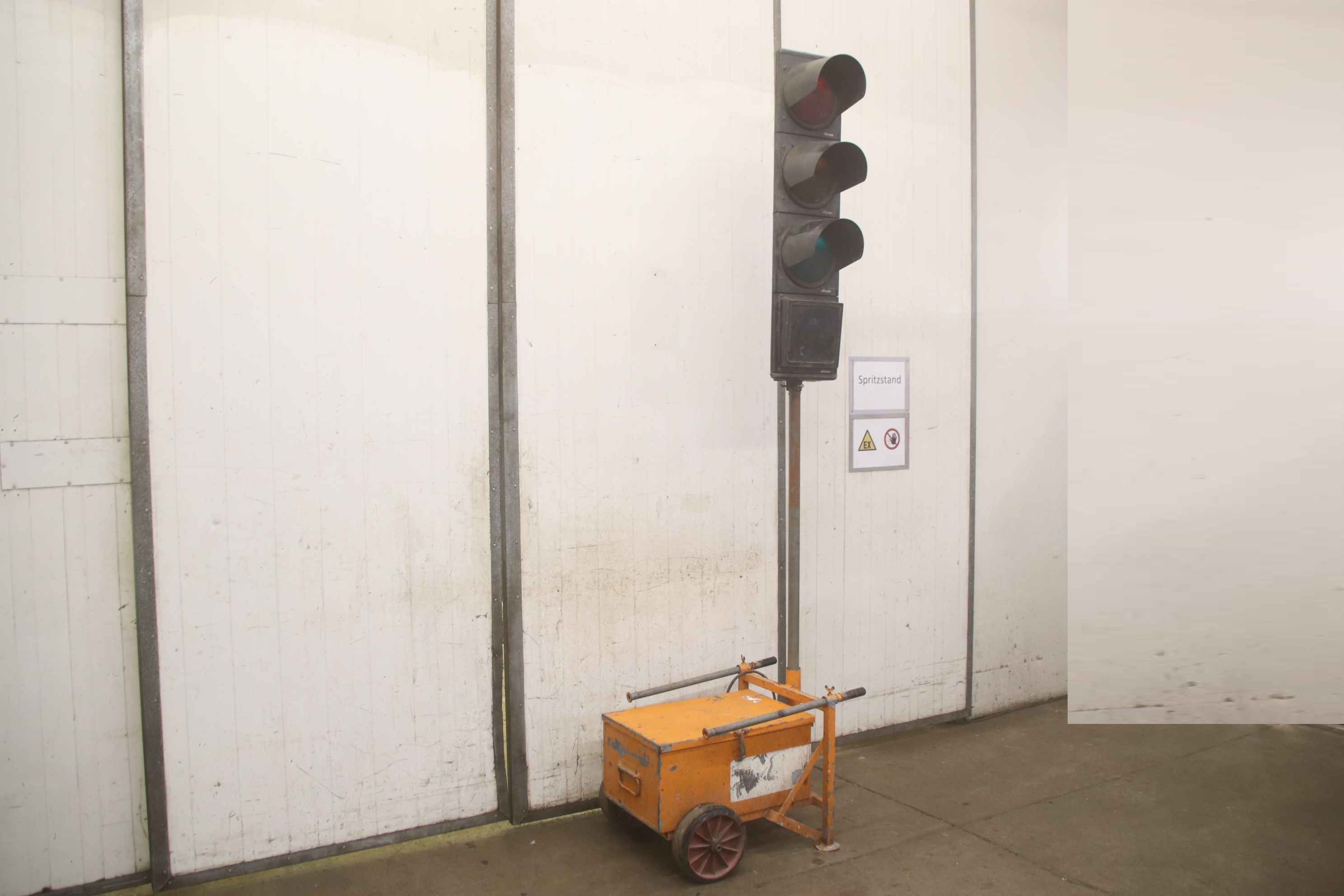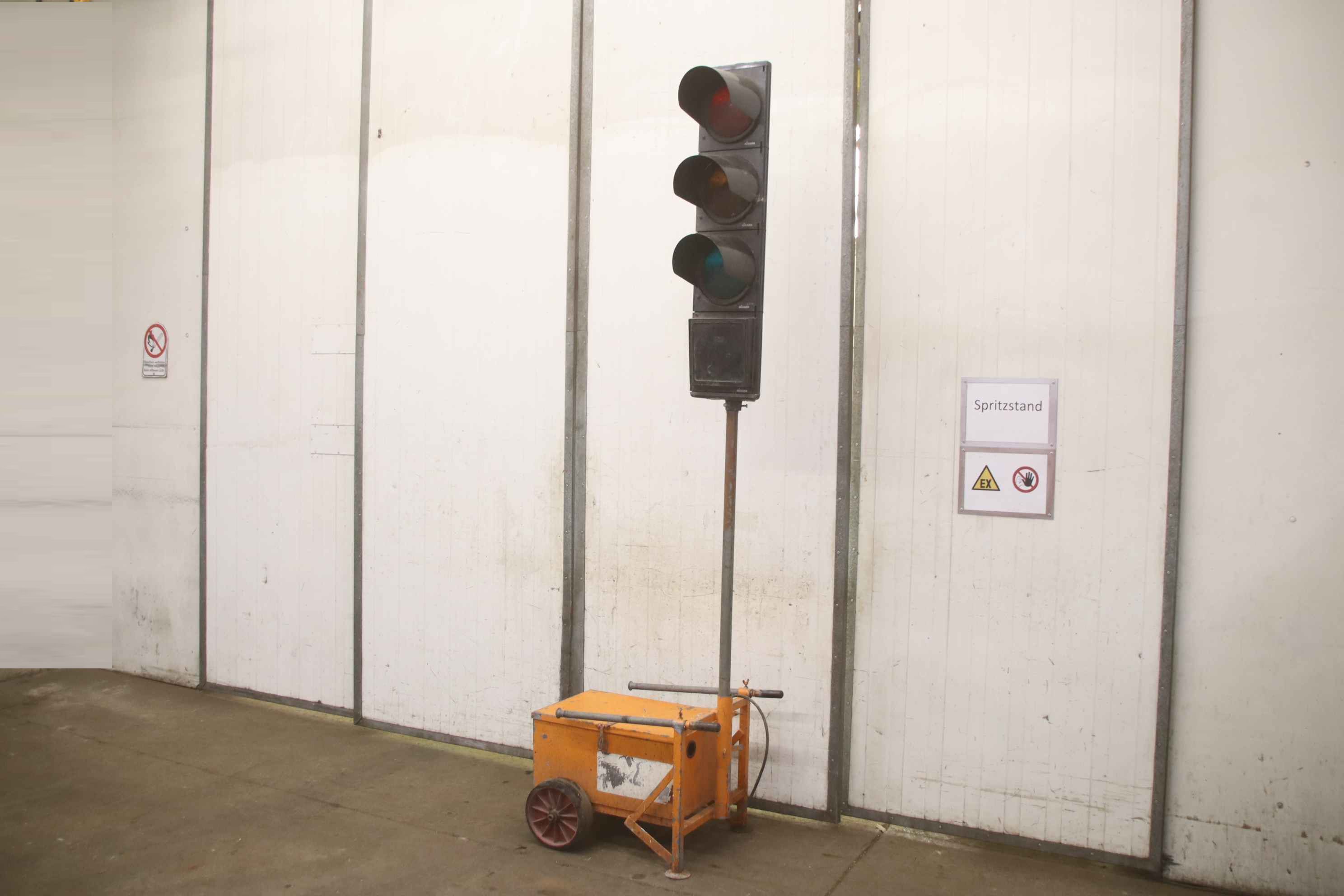 Traffic light system, construction site traffic light, traffic signal system, mobile traffic light system, traffic light -Handover: in its current condition as inspected Accessories: without controller, without battery and other accessories -Manufacturer: nissen, mobile traffic light system / 2 traffic lights on battery-powered cart Price: complete -Dimensions: 800/600/H2800 mm -Transport dimensions: 1400/800/H1400 mm -Weight: 44.5 kg/pc.