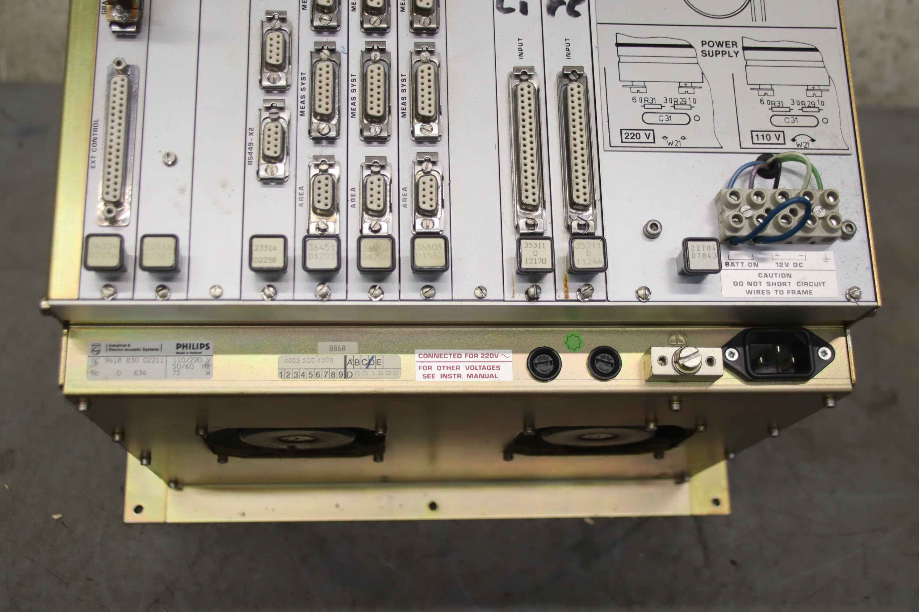 CNC control, card slot, control cards, plug-in cards, circuit boards, control rack-Manufacturer: Philips, control rack from CNC milling machine MAHO MH 800C-PCB: 4022 224 7062-Card: 4022 224 3433-Graphic Modem: 4022 224 3451-Cent Proc: 4022 226 2331-Drive Mod.: 4022 226 3645 / 4022 226 3690-LS/LS board: 4022 226 3680-Inp Outp Mod: 4022 226 3531 2 pieces-Power supply: 4022 226 2270 PE 1870/03-Individual components: see photos-Price/sale: complete-Dimensions: 375/310/H340 mm-Weight: 13.4 kg