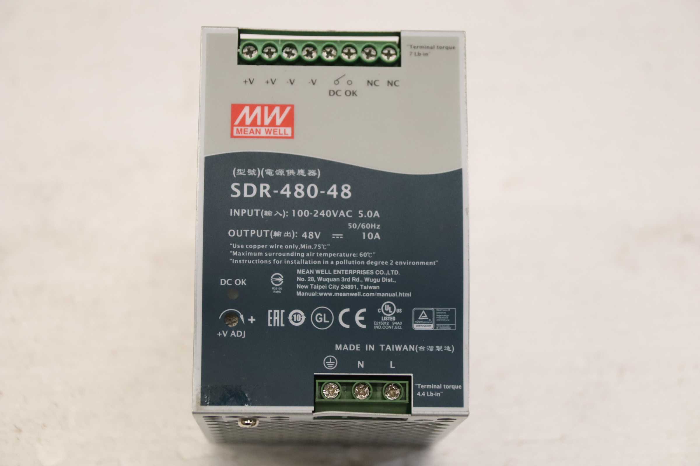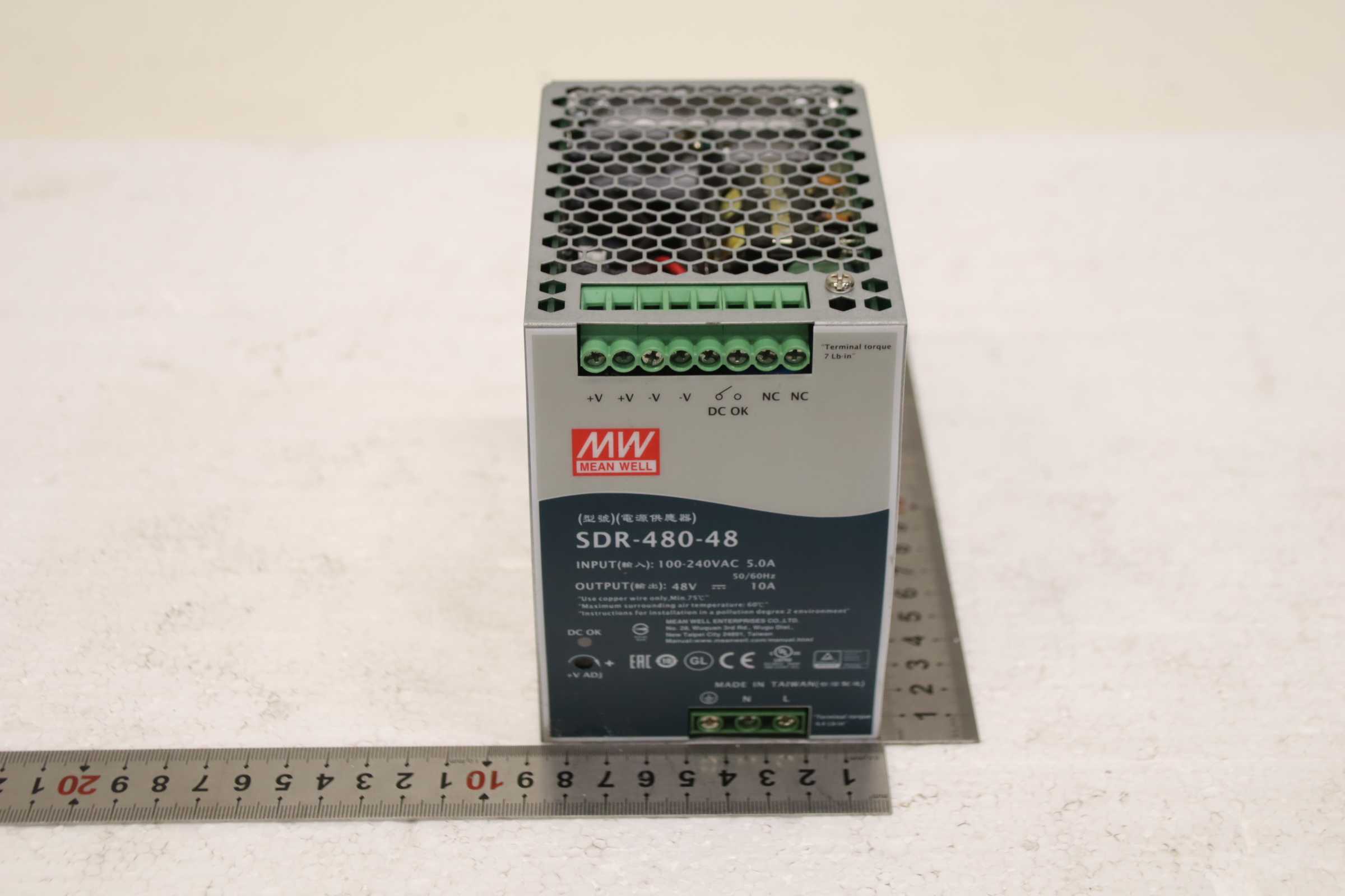 Converter, power supply, switching power supply, DIN rail power supply, servo module, AC/DC power supply, DC power supply, power supply module -Manufacturer: Mean Well, DIN rail switching power supply -Type: SDR-480-48 -Input: 100-240 VAC 5.0 A 50/60 Hz -Output: 48 V / 10 A -Quantity: 1x power supply unit included -Dimensions: 130/85/H140 mm -Weight: 1.6 kg