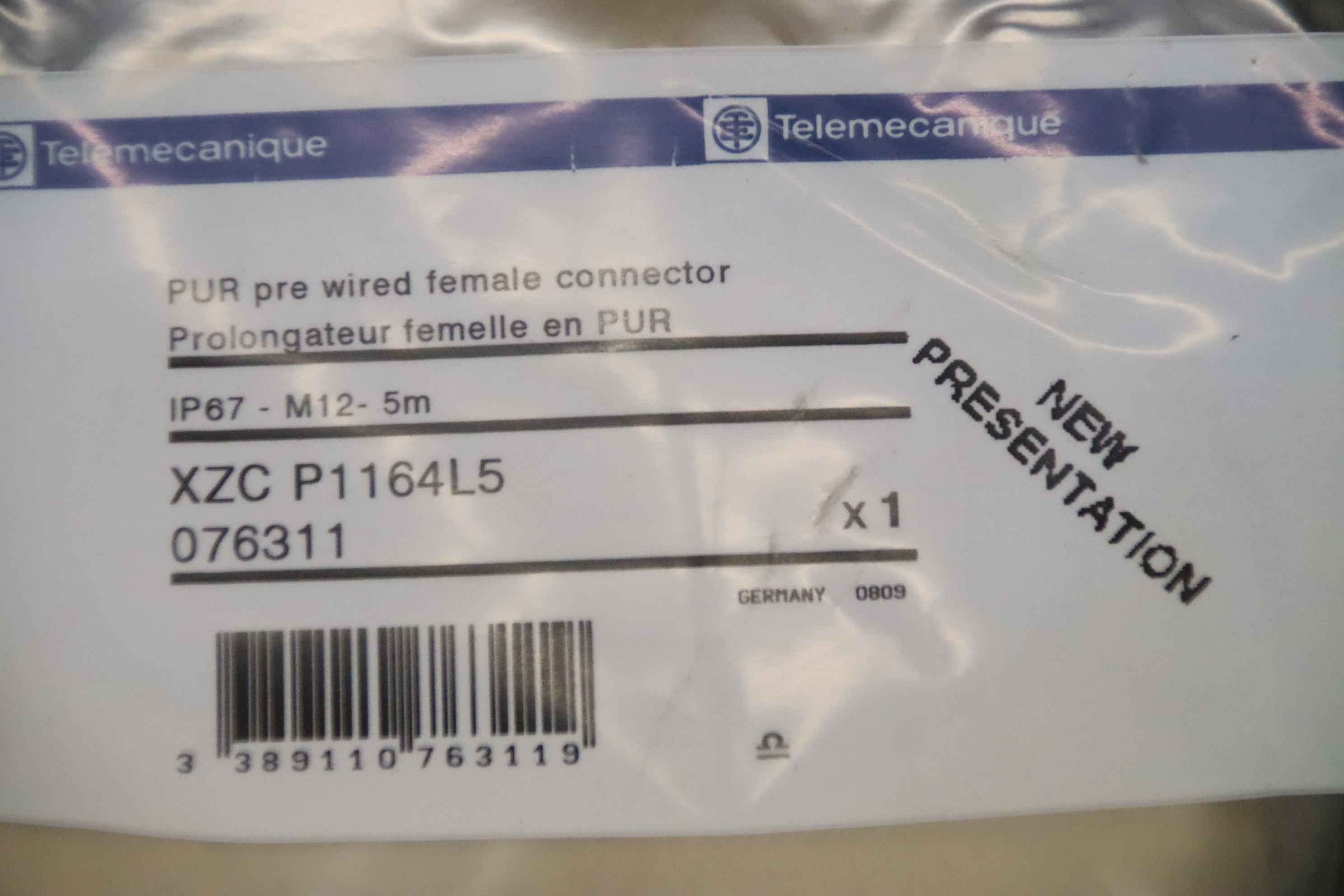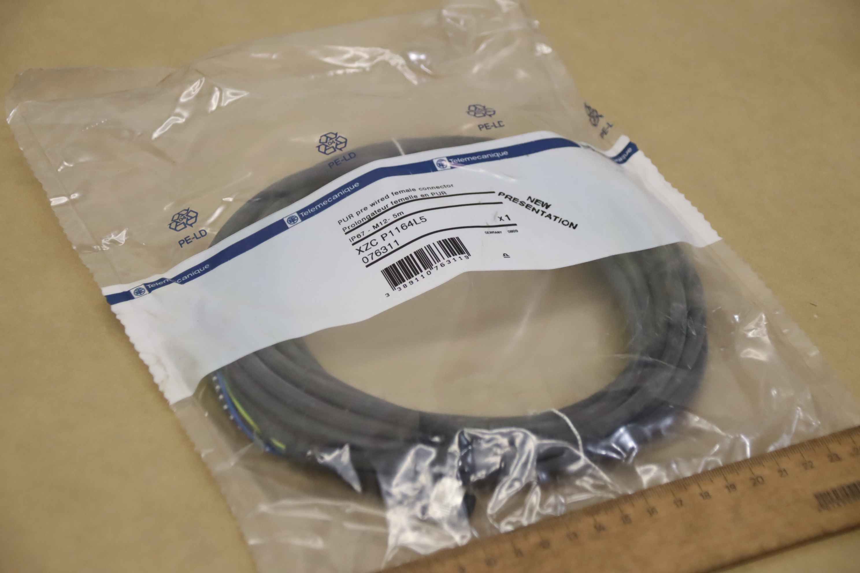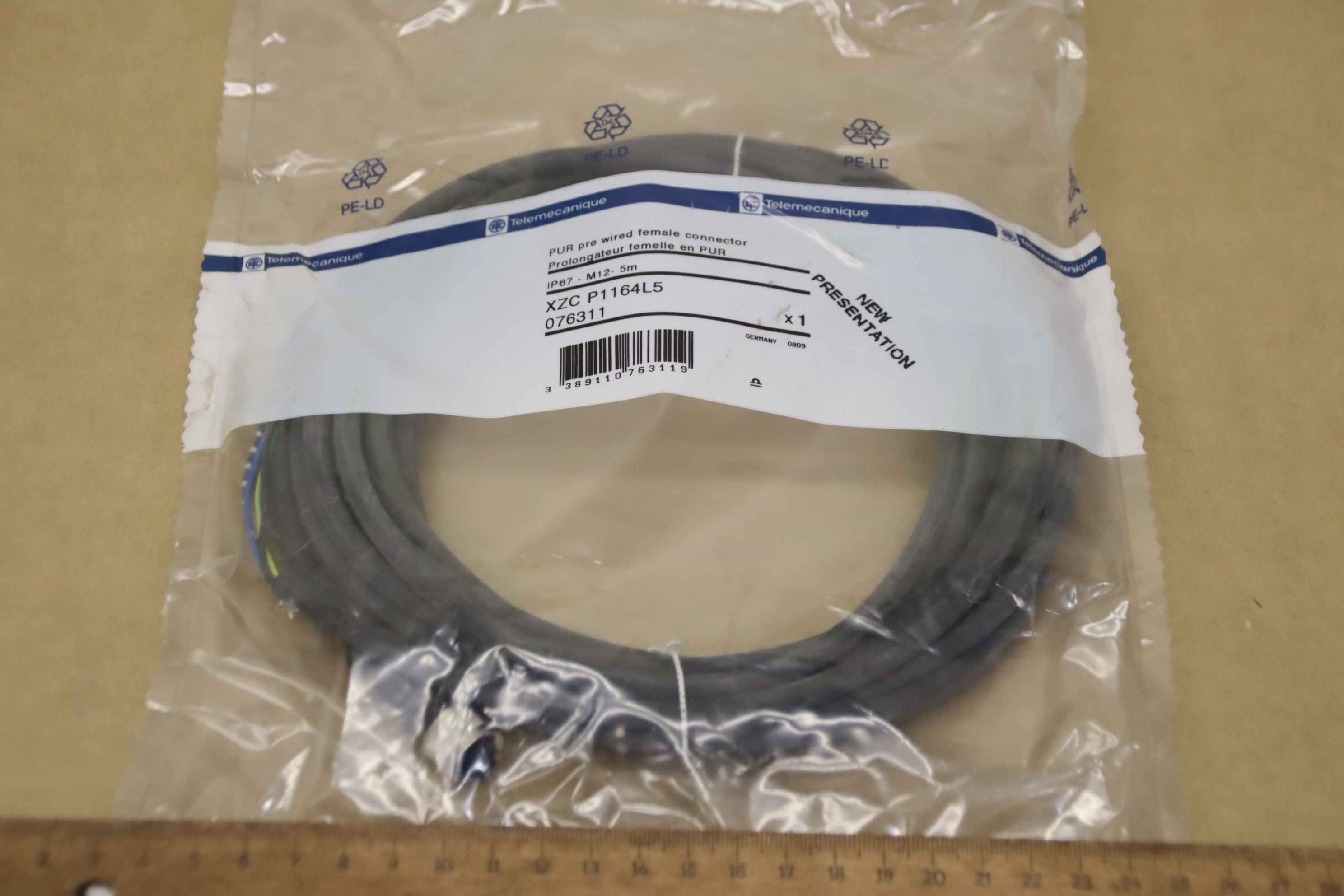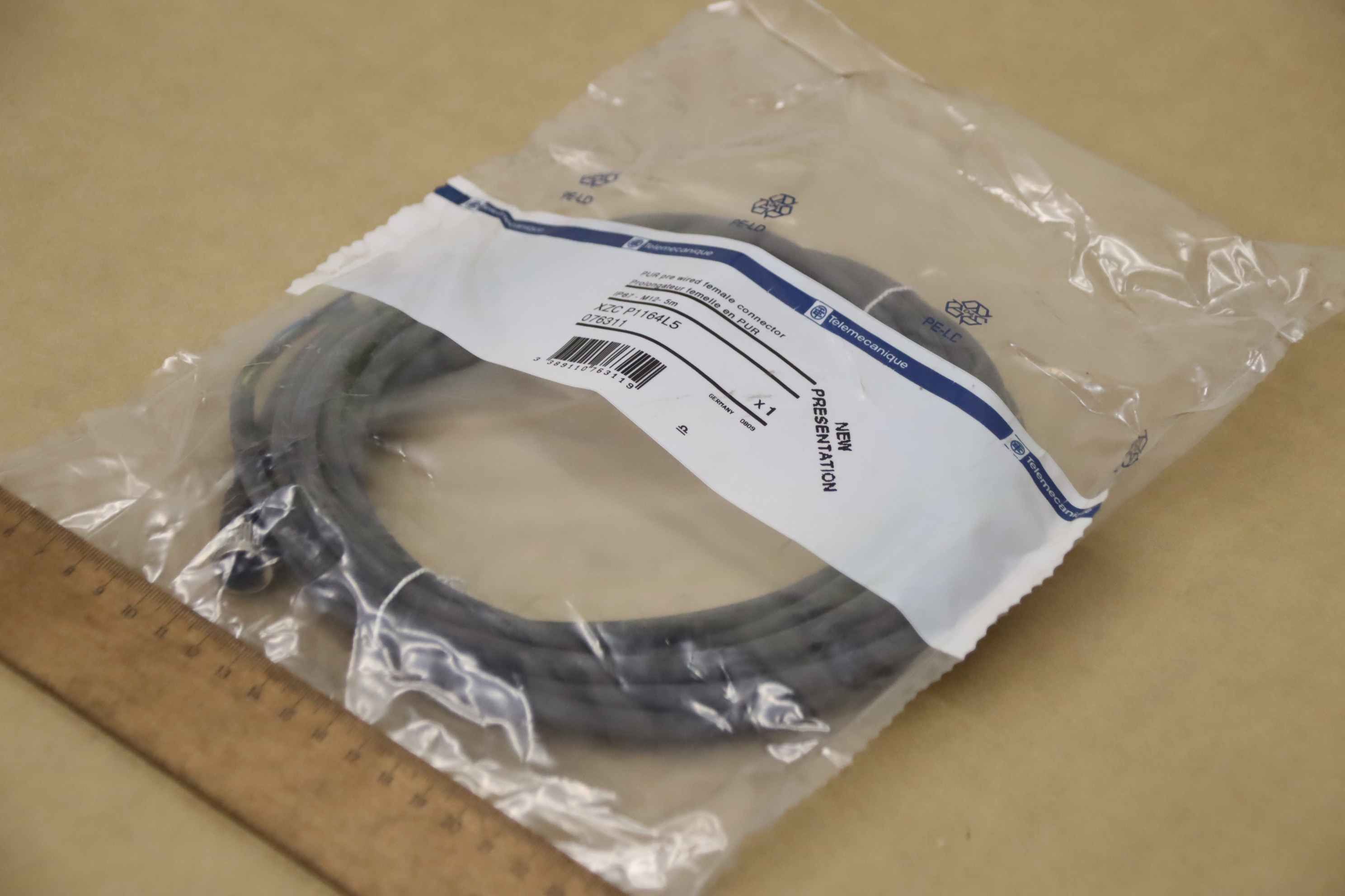 Inductive sensor, electronic sensor, sensor cable, connection cable, connection cable-Manufacturer: Telemecanique, ready-made sensor cable orig-Type: XZC-P1164L5-Order No.: 076311-Number: 10x cables available-Price per piece-Dimensions packaging: Ø 190 x 30 mm-Weight: 0.3 kg/pc.