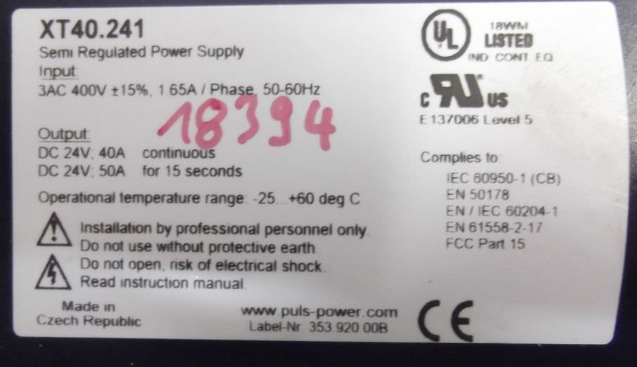 Power supply, converter, converter, power supply unit -Type: XT40.241 -Input: 3AC 400 V -Output: DC24V/40A -Dimensions: 250/170/H140 mm -Weight: 1.6 kg