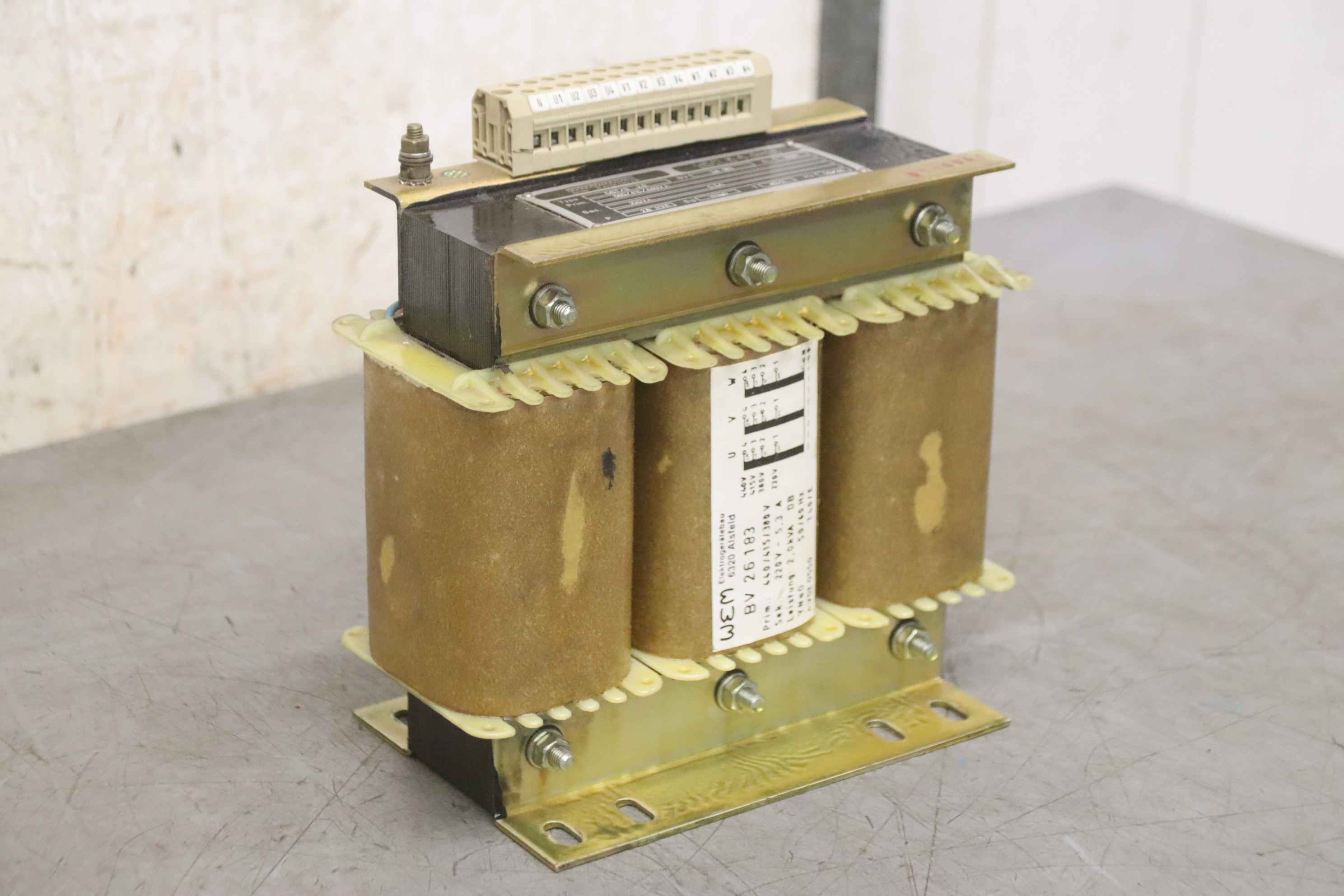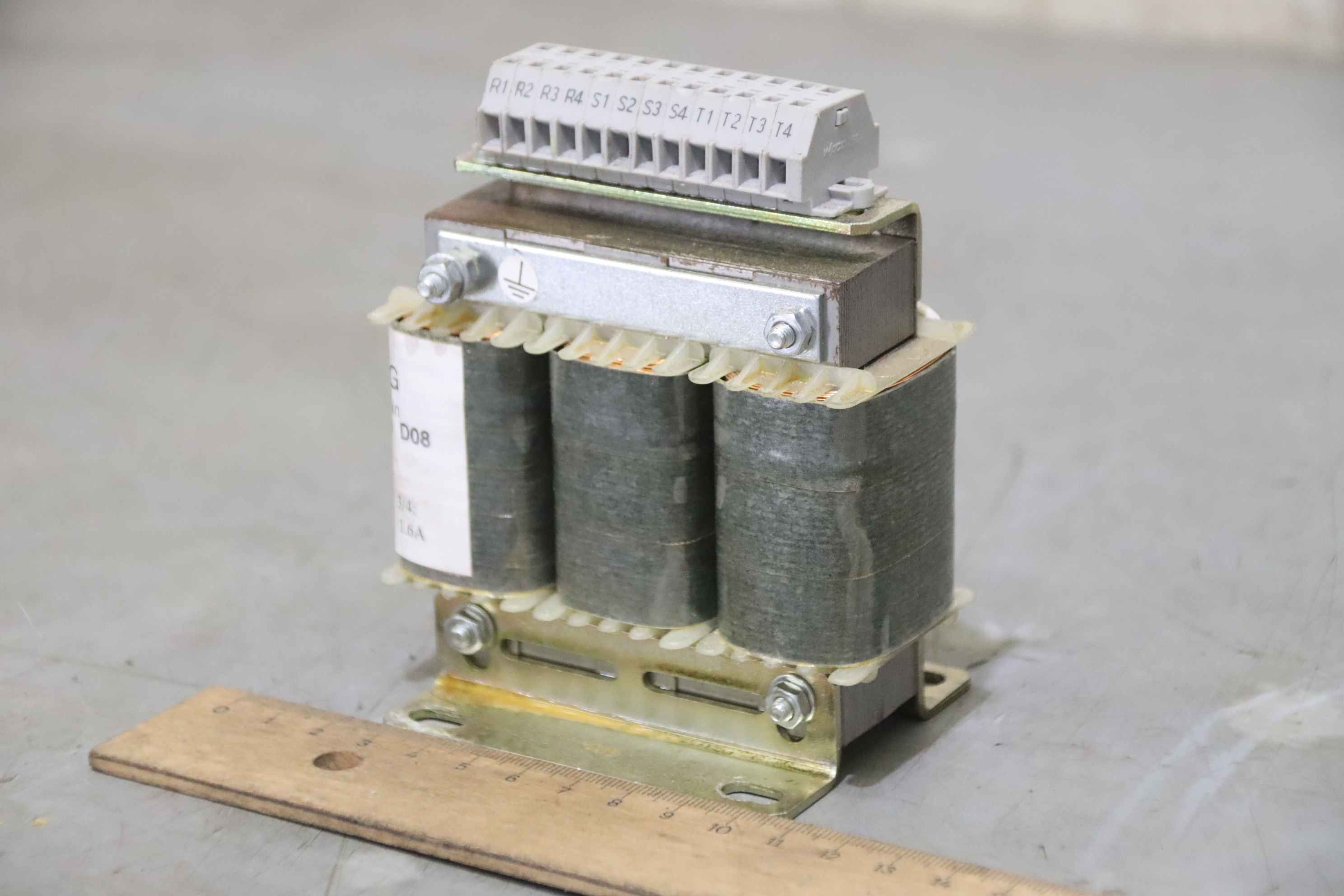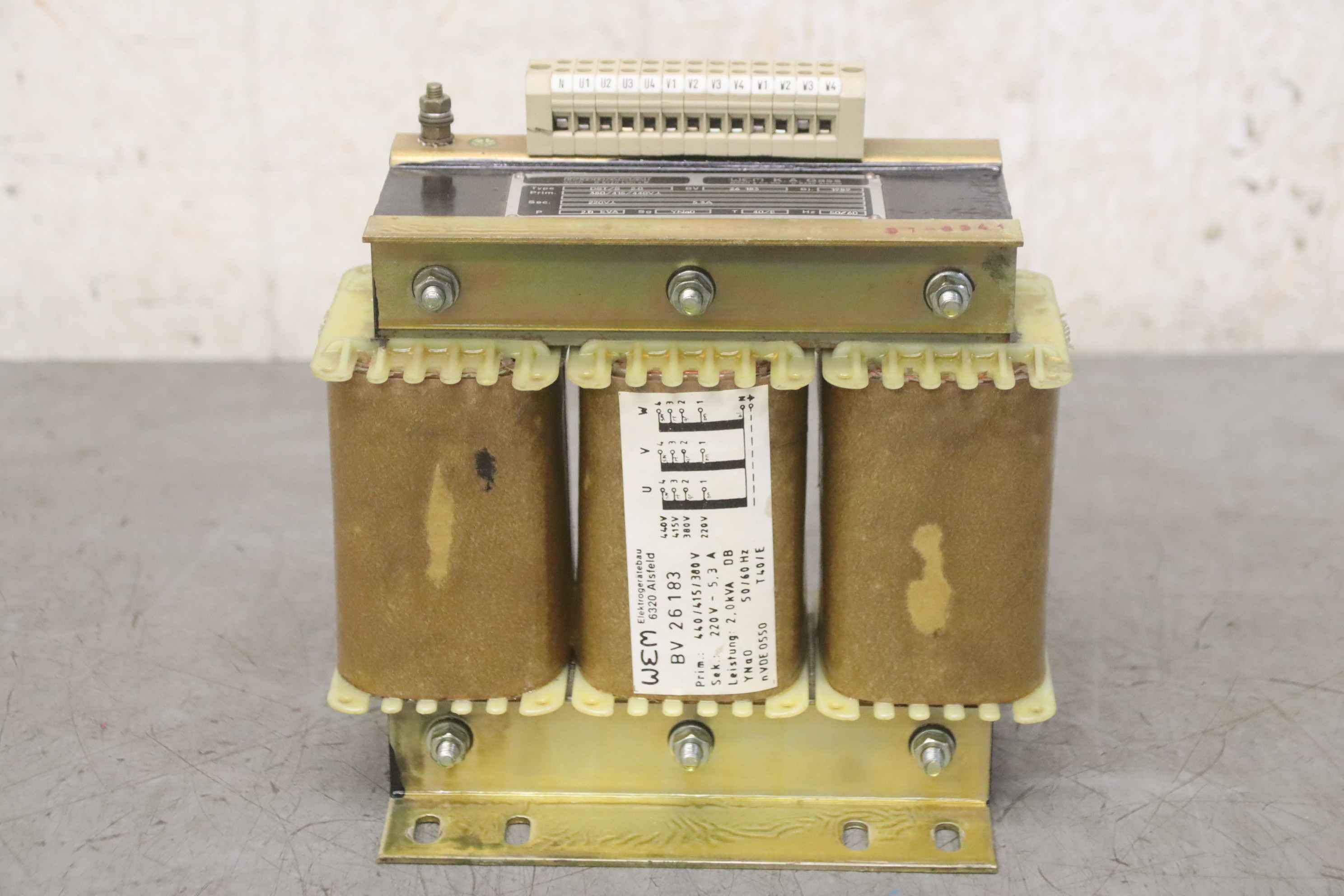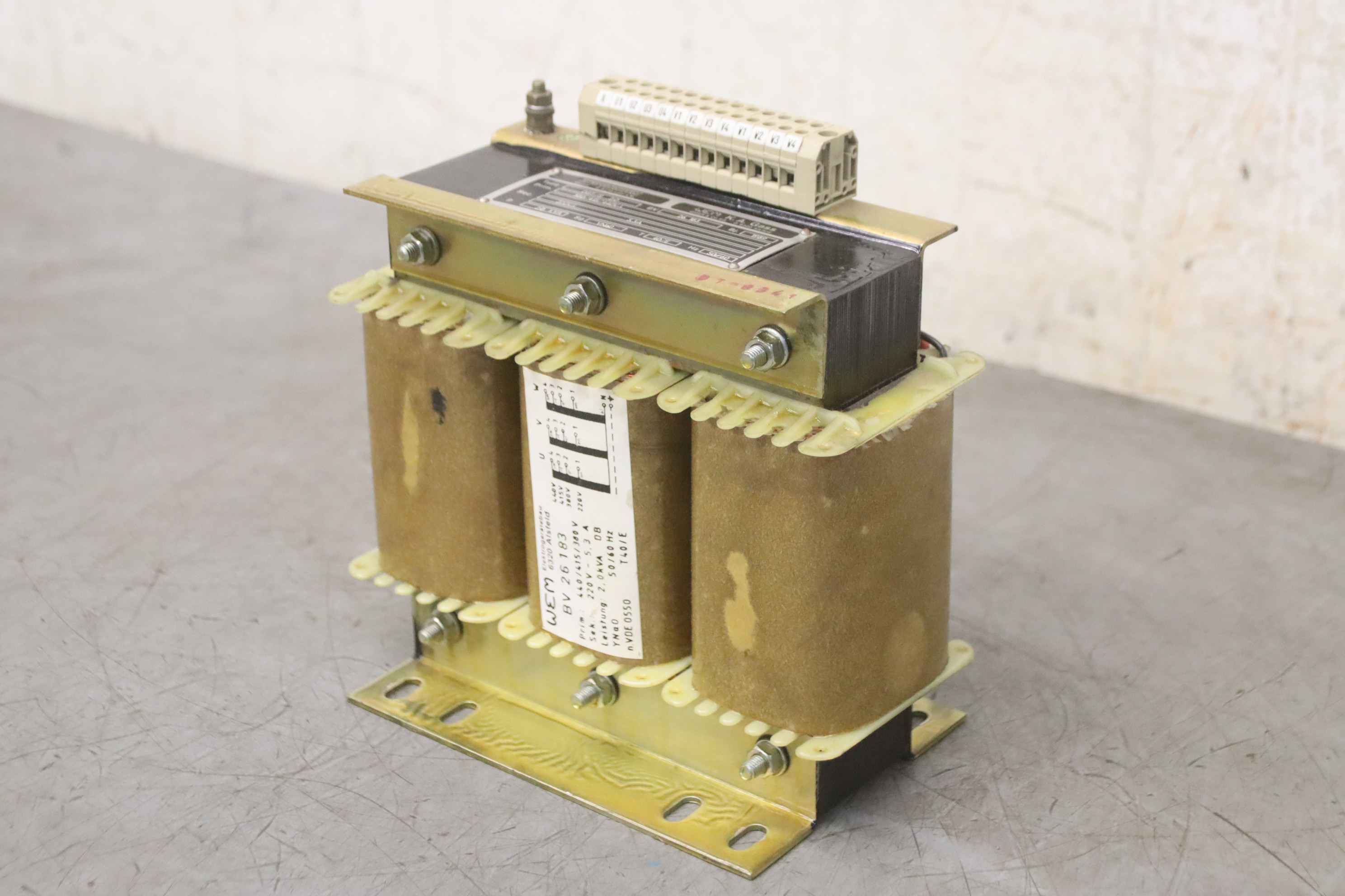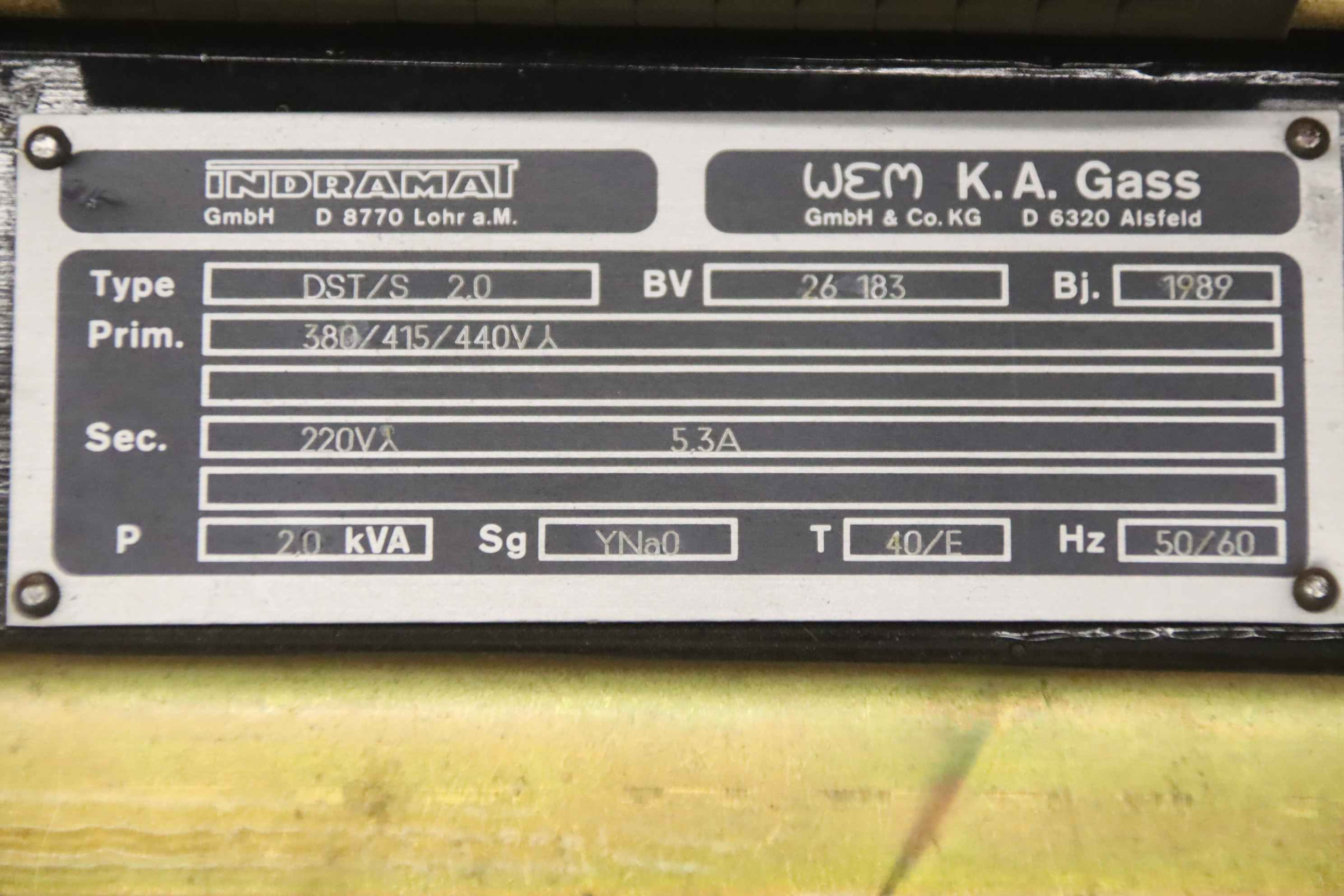 Transformer, transformer, converter, three-phase autotransformer, three-phase transformer-Manufacturer: Indramat, three-phase transformer type DST/S 2.0-Power: 2,0 kVA-Primary: 440/415/380V-Secondary: 220V - 5.3A-Dimensions: 200/115/H200 mm-Weight: 12 kg
