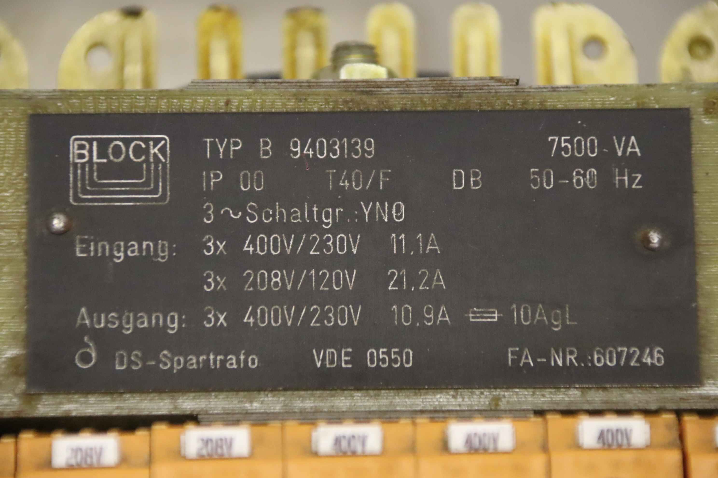 Transformer, converter, three-phase autotransformer, three-phase transformer, three-phase transformer, single-phase transformer -Manufacturer: Block, Transformer DS-Autotransformer type B 9403139 -Power: 7500 VA -Technical data: see photo of the nameplate -Number: 10 transformers available -Price: per piece -Dimensions: 295/120/H280 mm -Weight: 31 kg/pc.