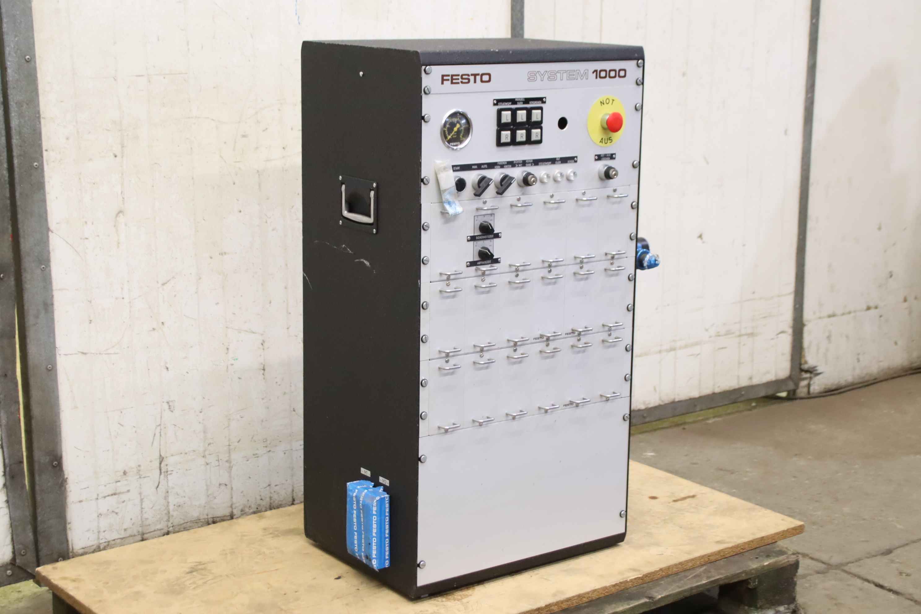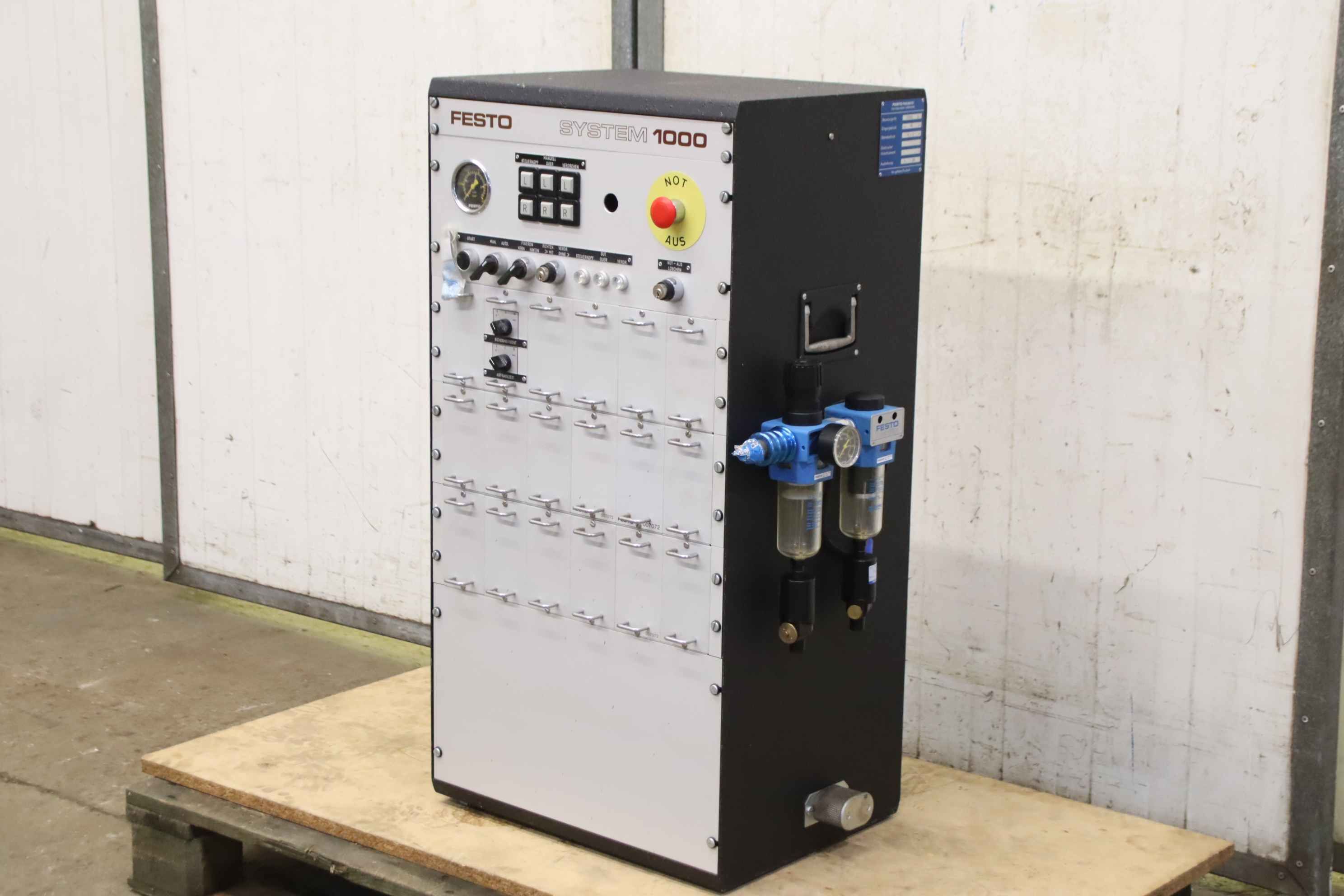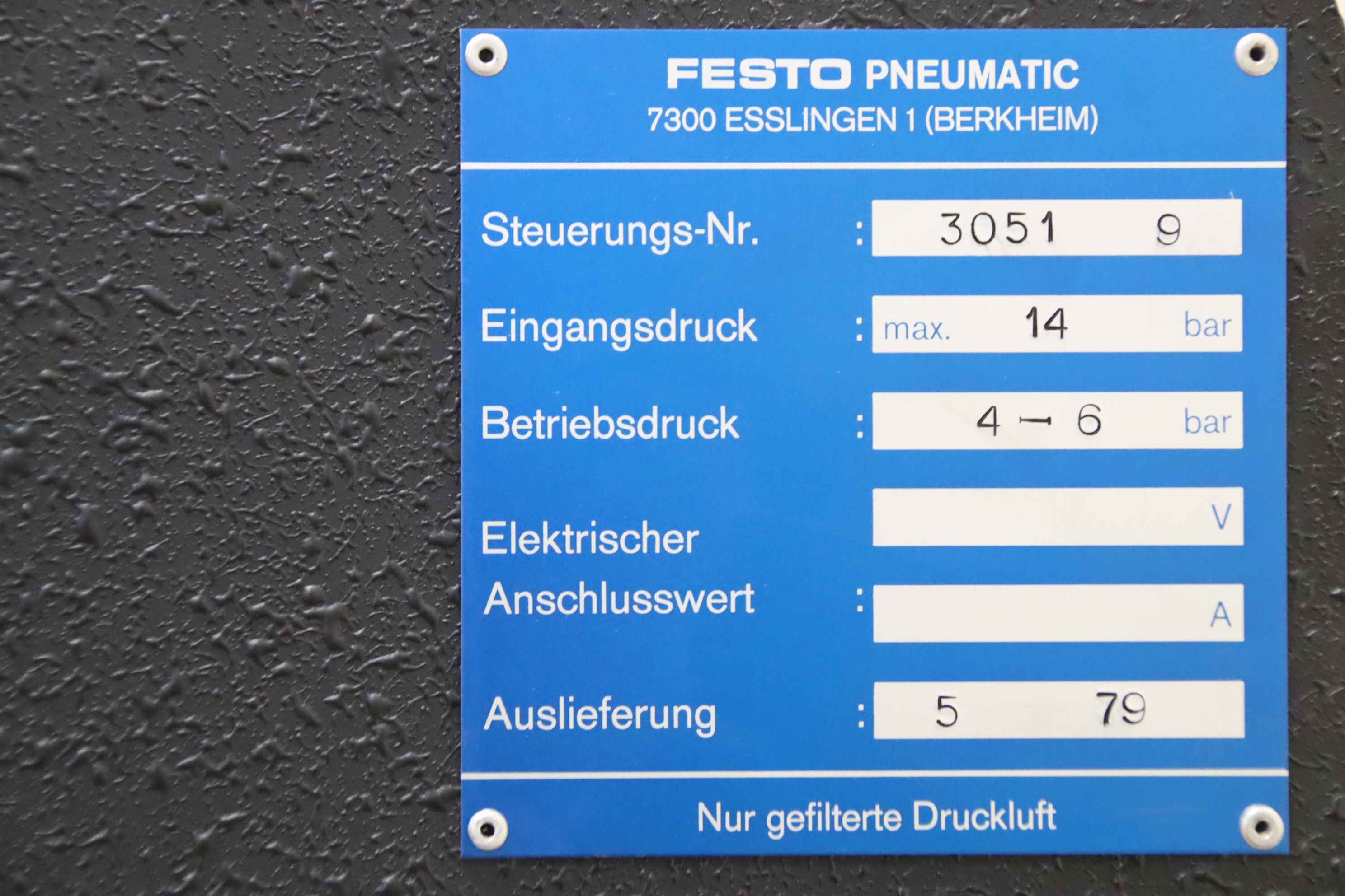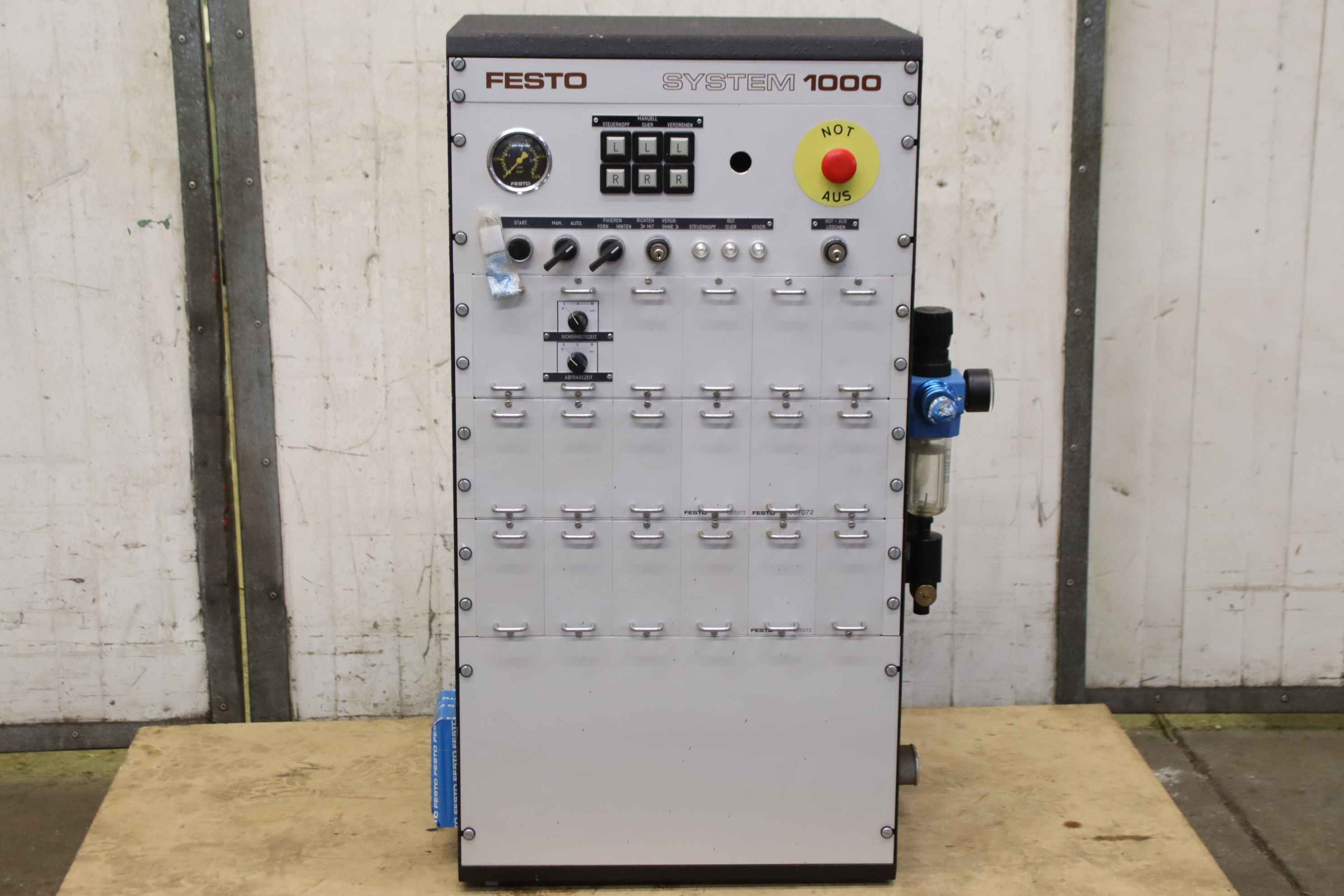 Control box, control unit, pneumatic control-Manufacturer: Festo, pneumatic control system 1000-Control no.: 3051 9-Inlet pressure: max. 14 bar-Operating pressure: 4 - 6 bar-Dimension: 490/410/H945 mm-Weight: 56 kg