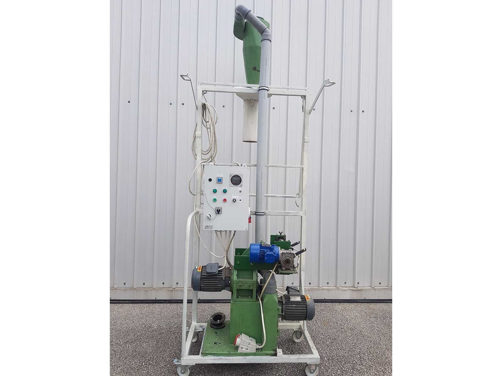 Granulador con alimentación forzada por barren; extracción del material por soplador, potencia de soplado: 0,75 kW; boca de alimentación: 370 x 300 mm; cámara de granulación: 250 x 270 mm; potencia del motor: 14 kW; palas giratorias: 3; palas fijas: 2; orificios de la rejilla: 6 mm.Número de serie: 1018A290291Peso estimado: 450 kg Dimensiones aproximadas: 2300x1200xh1000 mm Auction-ID: A7-44996-32