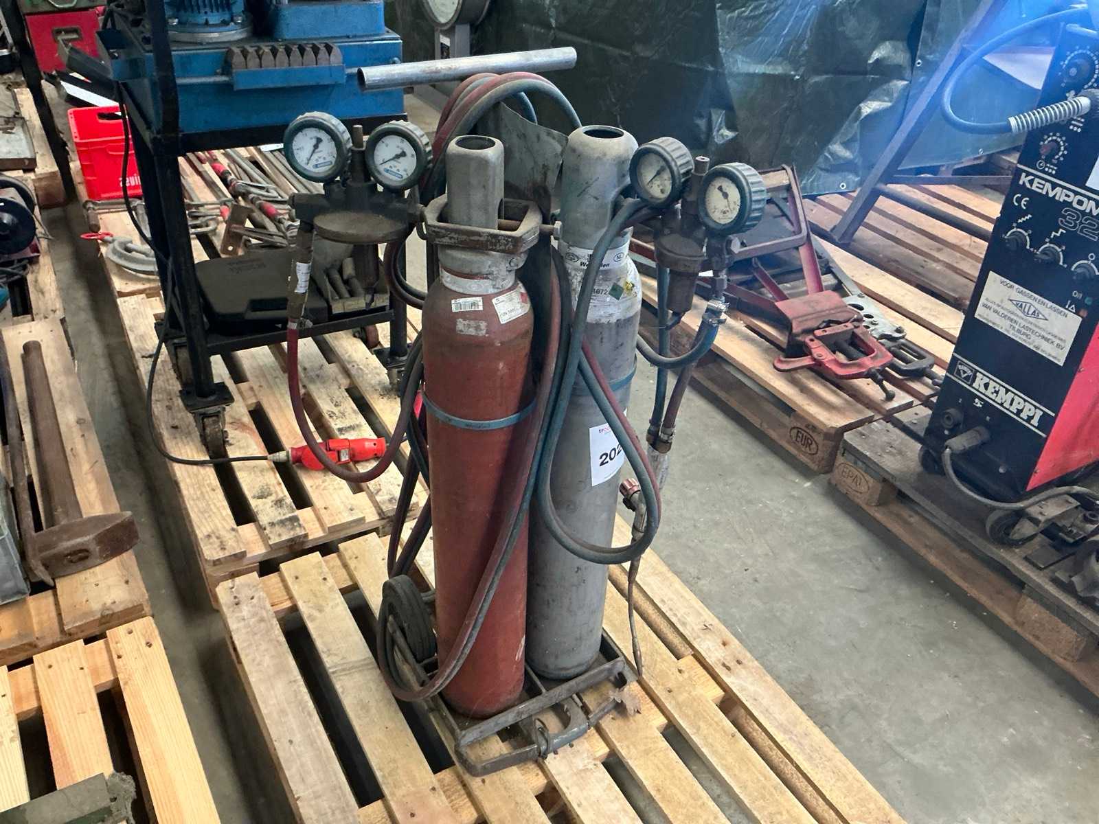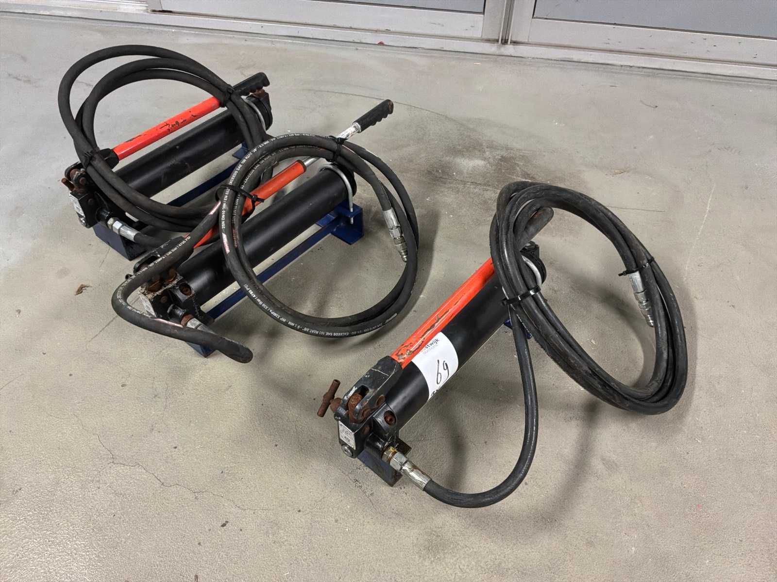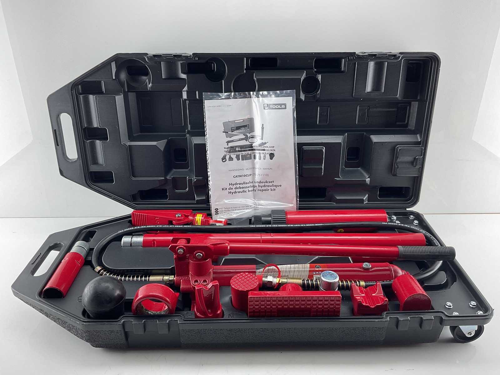 Hydraulic set with 10 ton pressure cylinder, consisting of a hand pump, hydraulic hose, 0.5 ton spreader and various attachments and extensions. Delivered in a plastic case with wheels for easy transport.