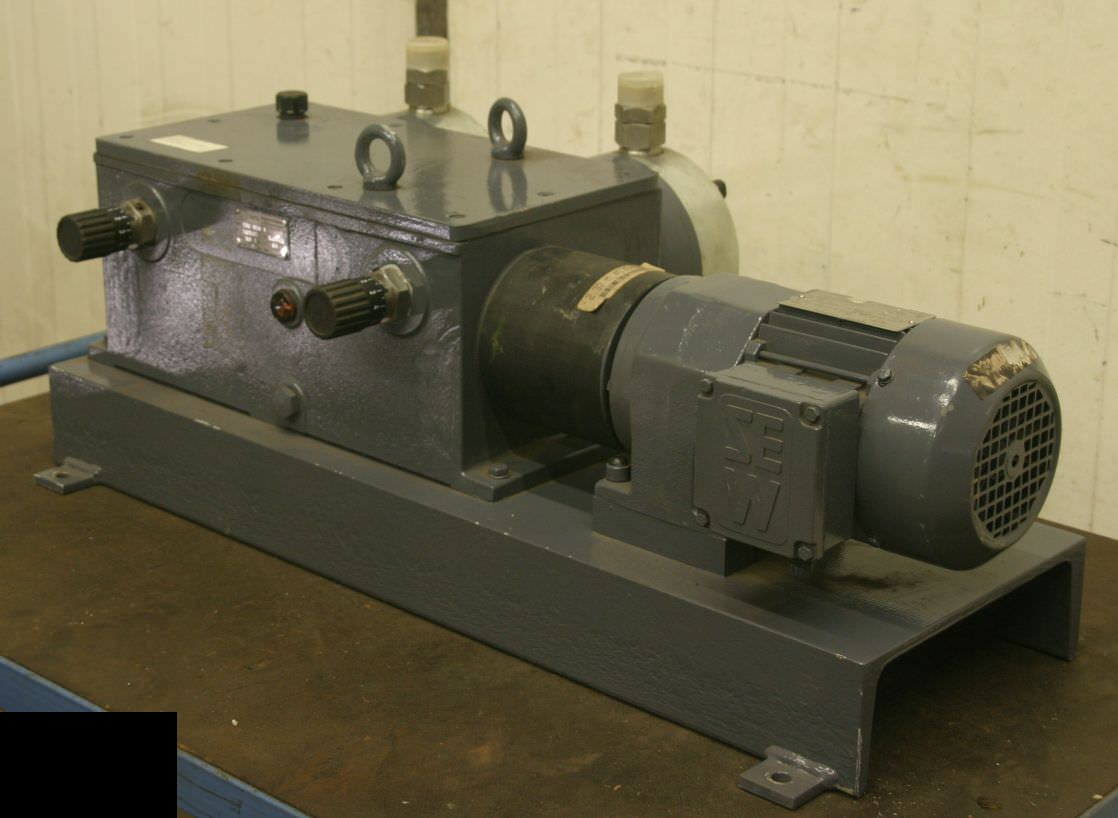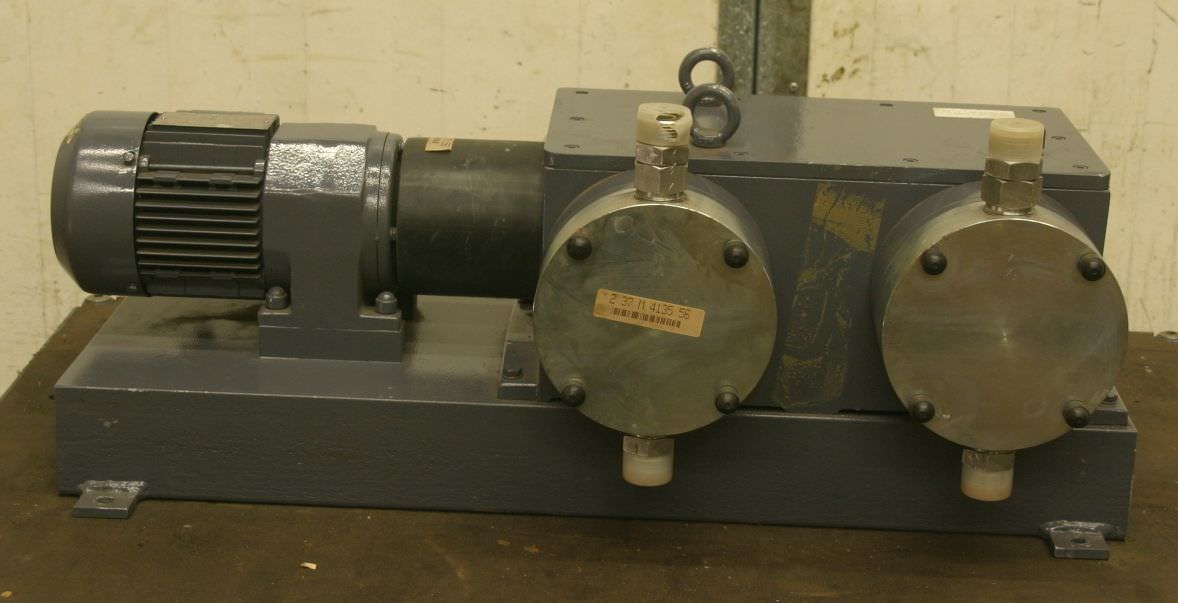 Dosing pump, 2-component dosing pump -for dosing liquid media -2x dosing capacity 0-300 l/h -Pressure: 3 bar -Drive: 0.37 kW/57 rpm -Quantity: 1 piece available -Dimensions: 830/400/H340 mm -Weight: 125 kg
