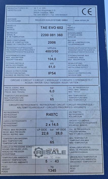 La Rehsler TAE EVO 602 es una enfriadora compacta refrigerada por aire del fabricante M.T.A. S.p.A., que está diseñada para uso en exteriores y está equipada con un búfer integrado y un tanque con bomba. Estos dispositivos están diseñados como soluciones totalmente equipadas que proporcionan una rápida