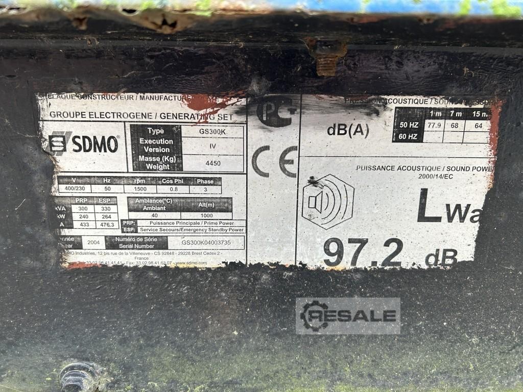 Marca SDMO Modelo: GS300K Año de fabricación: 2004 Número de serie: GS300K04003735 Horario de funcionamiento (leído) 158 Capacidad (KvA) 315-330 Marca de motores Volvo Penta Modelo de motor TAD1032GE Motor de capacidad (Kw) 296 Diésel combustible Marca alternadora Leroy Somer Alternador modelo ...