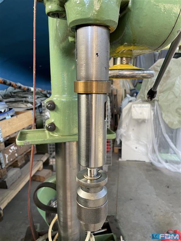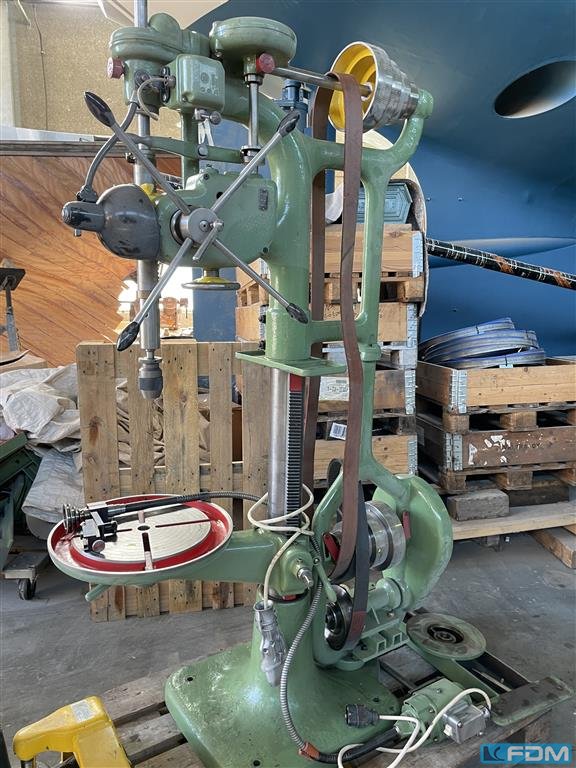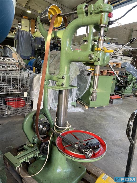bore capacity in steel (diameter):12 mmthroat:300 mmbore stroke:80 mmtotal power requirement:1,5 kWweight of the machine ca.:1,2 tdimensions of the machine ca.:0,6 x 0,7 x 2,1 mAppr. 100 year old column boring machine, complete overhould and ready to operate- swivel table, base table- taper tool chuck- base motor with drive belt to overhead spindle