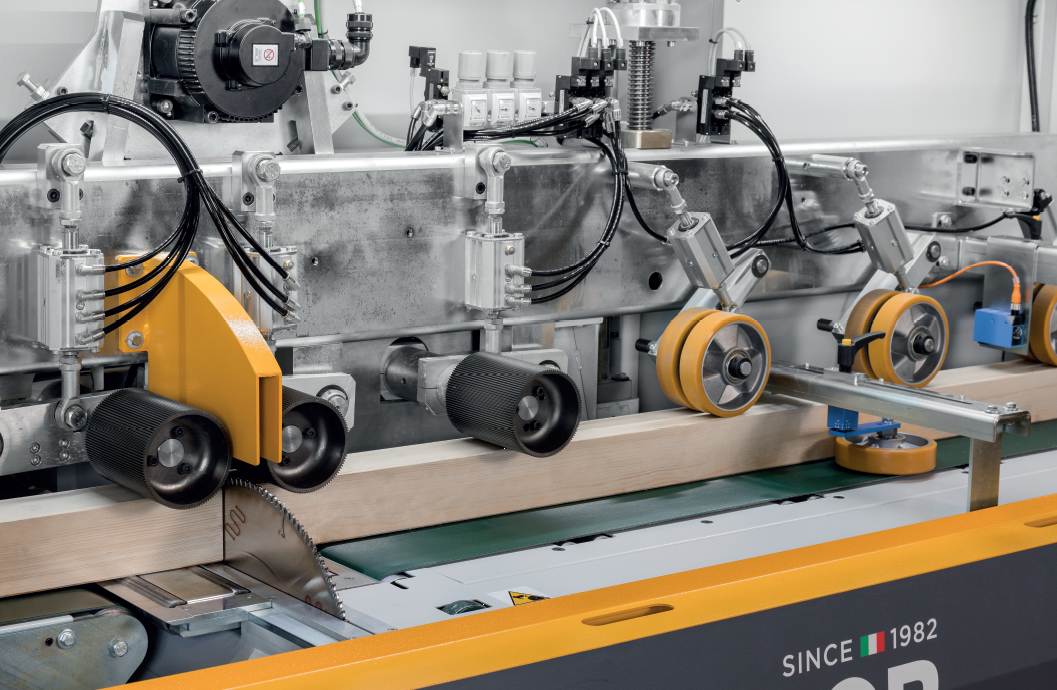Optimierungskappsäge Fabrikat: SALVADOR Typ: Supercut 300 Neumaschine Optimierende Säge zum senken der Kosten Die extrem schnelle optimierende Kappsäge Supercut 300 kann das Produktionssystem eines Unternehmens revolutionieren. Äußerst robust Die Struktur besteht aus dickem, verstärktem und lackiertem Stahl. Das Einlaufband ist synchronisiert und wird vom gleichen Motor wie auch die Vorschubwalzen angetrieben. Einzigartiges duales und solides oberes und unteres Vorschubsystem. Die obere Antriebseinheit besteht aus 3 Zahnrädern und 6 Laufrollen (3 Paare), die von oben auf das Holz drücken. Das Anheben und Absenken der Zahnräder wird direkt von der rechnergestützten numerischen Steuerung gesteuert. Schnell Optimierung sowohl in Hinblick auf die Schnelligkeit als auch den Gesamtablauf, und das bei einer Maschine, die durch ihre kompakten Abmessungen ...