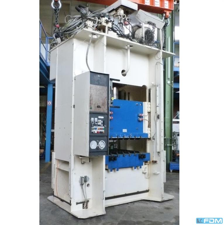 Prensa hidráulica de 1500 toneladas. Juego entre los dos pistones laterales = 1400 mm. Distancia entre montantes = 400 mm. Distancia vertical entre tableros abiertos 3200 mm. Dimensiones de la mesa móvil = 1700 x 1800 mm. Tamaño fijo de la mesa = 1500 x 2000 mm. Esta prensa se ha utilizado para producir horquillas para carretillas elevadoras.