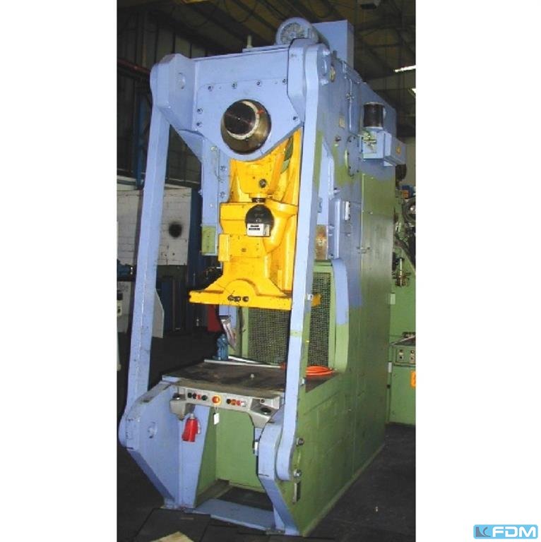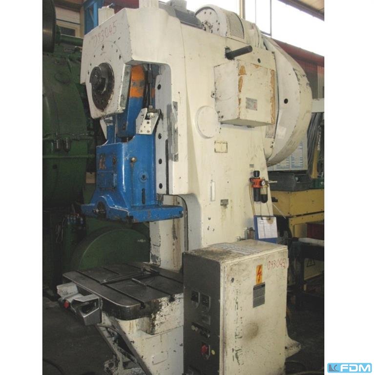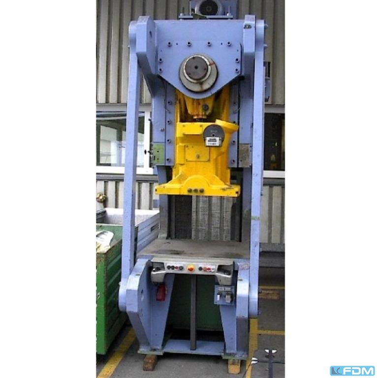 Prensa excéntrica de una sola columna WEINGARTEN tipo E 40 Masch. Nº 643 / 62 Año de construcción 1963 Capacidad de presión 40 ton. Proyección 250 mm Apertura de la mesa 150 x 80 y 200 mm Superficie de la mesa 560 x 460 mm Área del émbolo 250 x 200 mm Carrera del ariete ajustable 8-88 mm Ajuste del émbolo 63 mm Altura de instalación 320 mm Orificio para pasador de apriete 40 mm Velocidad de carrera 100 / 130 carreras / min. Potencia del motor 2,2 / 3 kW Conexión a la red 400 voltios, 50 Hz Altura de la mesa sobre el suelo 840 mm - Combinación de embrague y freno gracias al embrague roscado por fricción de WEINGARTEN con protección de flujo OT - Desbloqueo eléctrico de la carrera mediante accionamiento con las dos manos - Protección contra sobrecarga mediante placa trituradora - Lubricación central de grasa manual - Cojinete de soporte del cigüeñal de ...