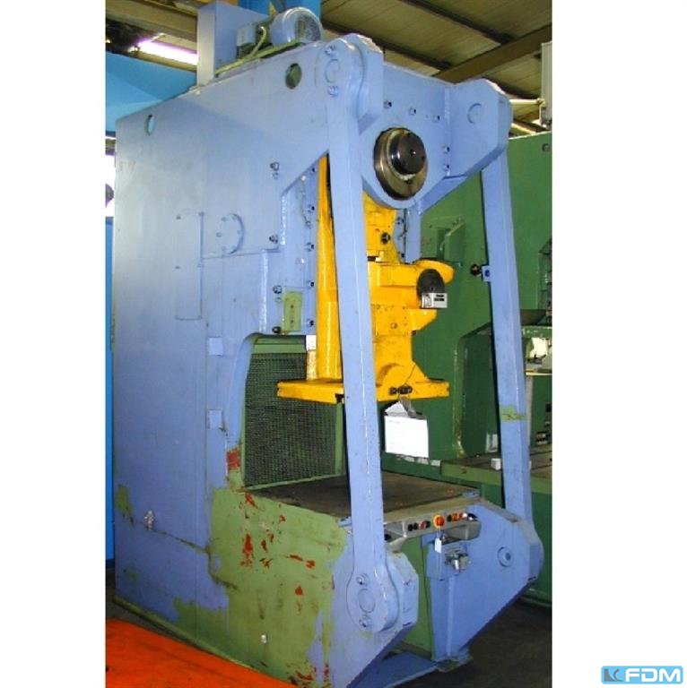Prensa excéntrica de viñedo tipo AR160 toneladas Con escudo protector. YOC 1971 2 velocidades de rotación a través de una caja de cambios mecánica Conmutable. Lubricación central. Acoplamiento de rosca empinada de bajo desgaste. Dimensiones de la mesa : 800x1000 mm Visitas: posibles en cualquier momento. Peso total aprox. 10,5 toneladas