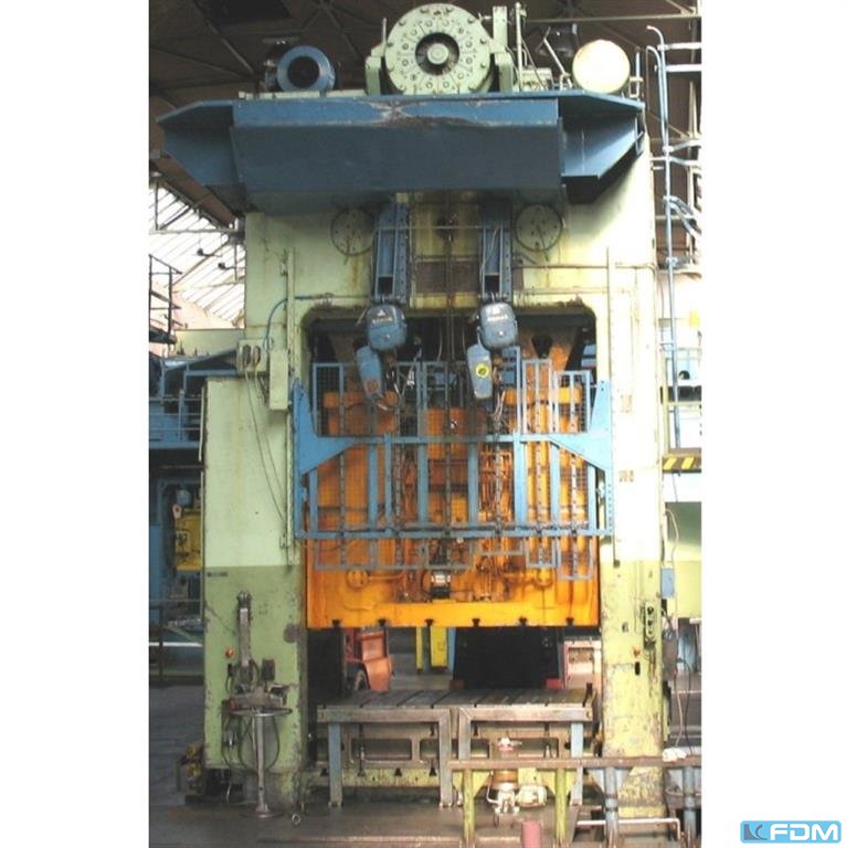 Prensa hidráulica de 1500 toneladas. Juego entre los dos pistones laterales = 1400 mm. Distancia entre montantes = 400 mm. Distancia vertical entre tableros abiertos 3200 mm. Dimensiones de la mesa móvil = 1700 x 1800 mm. Tamaño fijo de la mesa = 1500 x 2000 mm. Esta prensa se ha utilizado para producir horquillas para carretillas elevadoras.
