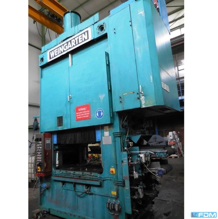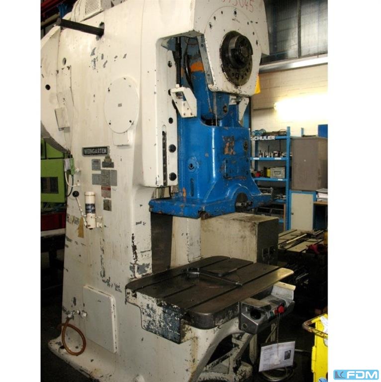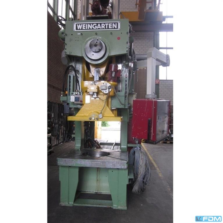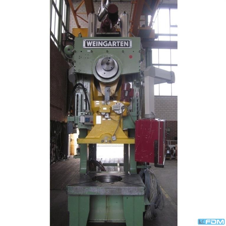 Weingarten AR 63 tonCapacidad: 63 ton Carrera máxima ajustable: 8 > 100 mm Velocidad de estirado: 56/84 str/min Dimensiones de la mesa: 620 x 500 mm Diámetro del orificio de la mesa: 250 mm Diámetro del punzón: 40 mm Ajuste de curso: 63 mm Peso: 4 toneladas