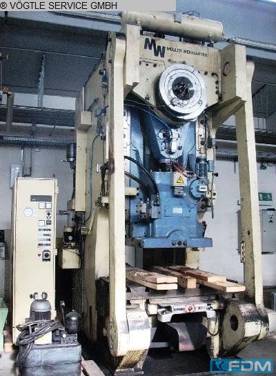 (1961) 100t Müller-Weingarten Eccentric Press Prensa mecánica de alta precisión Este modelo Müller-Weingarten es un caballo de batalla industrial versátil que cuenta con carrera variable y un motor de alto rendimiento de 11 kW. Diseñado para aplicaciones de gran duración, puede procesar grosores de materiales de hasta 12 mm con una velocidad de funcionamiento constante de 55 carreras por minuto. Detalles técnicos Tipo de máquina: Prensa excéntrica Fabricante: Müller-Weingarten Modelo: ER 100 Año de fabricación: 1961 Fuerza nominal: 100t Grosor máximo del material: 12 mm Frecuencia de golpes: 55 golpes/min Carrera del ram (ajustable): 8 mm – 112 mm Ajuste de la RAM: 80 mm Altura de cierre (espacio de troquel): 355 mm – 407 mm Tiempo de sobrevuelta (tiempo de parada): 0,174 segundos Distancia de seguridad: 278 mm Potencia del motor: 11 kW