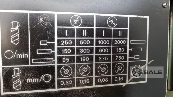 Altura de la punta: 150 mm Ancho central: 760 mm Giratorio Ø sobre la cama y el corredero de soporte: 300/165 mm Diámetro del husillo: 32 mm Soporte de husillo, estrecha corta según DIN 55027: Gr. 5 Taper de la punta de reversa: MK 3 12 velocidades de husillo: 85 - 2000 rpm 48 alimentaciones: 0,006 - 1,77 mm 48 pasos métricos de rosca: 0,1 - 28 mm Rosca de 58 pulgadas: 75 - 2,5 gg/" 19 hilos de módulo: 0.1 - 1.75 módulo 19 Hilos de paso diametral: 70 - 4 DP electr. Potencia: 220/380 V, 1400 rpm, 2,2 kW Peso: 800 kg Requisitos de espacio: 1800 x 770 x 1300 mm